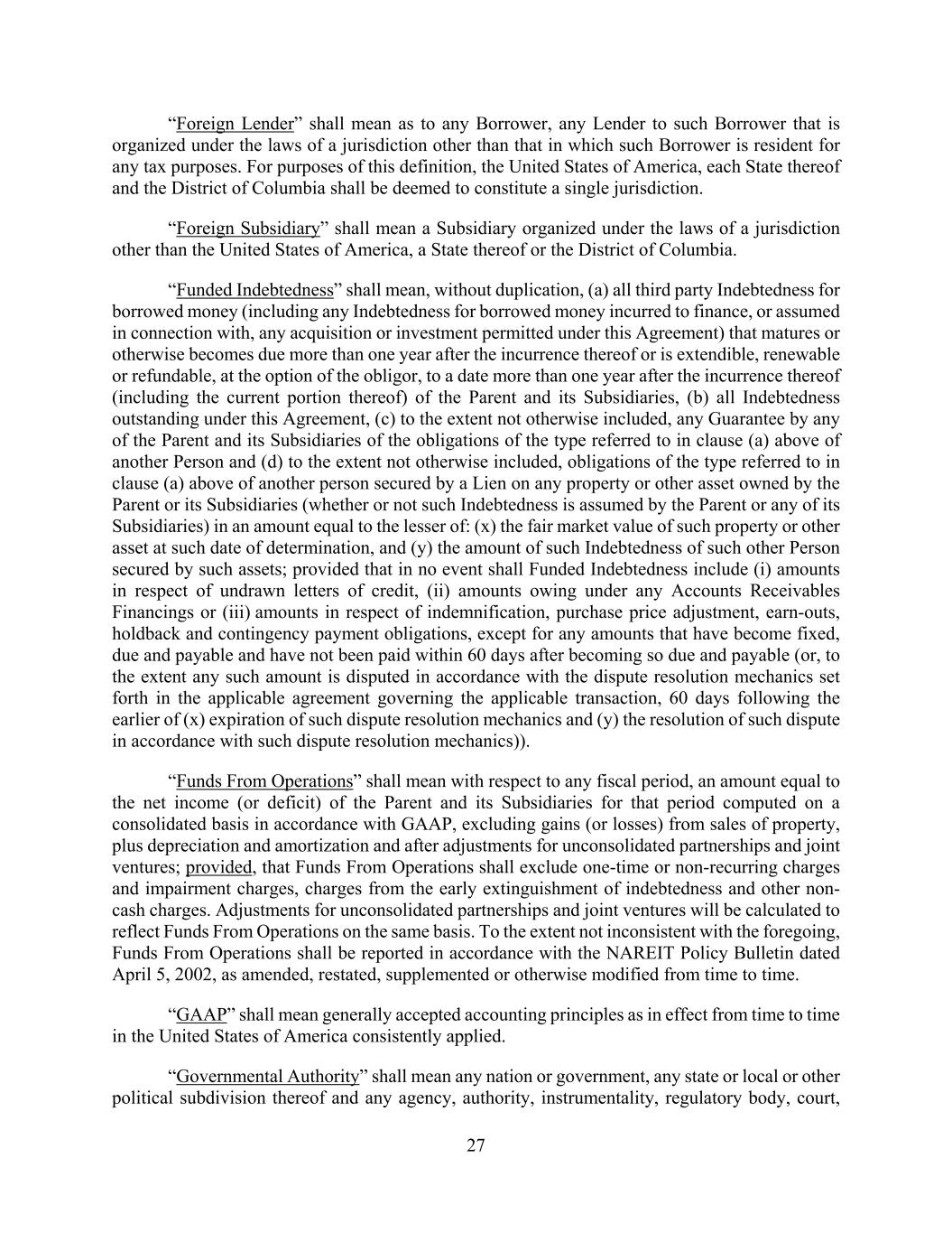 27“外国贷款人”是指就任何借款人而言,根据该借款人居住地以外的司法管辖区的法律为任何税务目的而组织的该借款人的任何贷款人。为本定义的目的,美利坚合众国、其每个州和哥伦比亚特区应被视为构成一个单一的司法管辖区。“外国子公司”是指根据美利坚合众国、其所在州或哥伦比亚特区以外的司法管辖区的法律组建的子公司。“已融资债务”是指(a)为在发生后一年以上到期或以其他方式到期的借款(包括为本协议允许的任何收购或投资进行融资或承担与之相关的任何借款债务)或可根据债务人的选择延期、可续期或可退还的债务,不得重复,(b)本协议项下的所有未偿债务,(c)在未另有包括的范围内,任何母公司及其子公司对另一人的上述(a)条所述类型的义务和(d)的任何担保,在未另有包括的范围内,由母公司或其子公司拥有的任何财产或其他资产(无论该债务是否由母公司或其任何子公司承担)上的留置权担保的另一人的上述(a)条所述类型的债务,金额等于:(x)该财产或其他资产在该确定日期的公平市场价值中的较低者,(y)该等资产担保的该等其他人的该等债务的金额;但在任何情况下,已融资债务均不得包括(i)与未提取信用证有关的金额,(ii)任何应收账款融资项下的欠款或(iii)与赔偿、购买价格调整、盈利、保留和或有付款义务有关的金额,但已成为固定、到期和应付且在到期和应付后60天内未支付的任何金额除外(或,如任何此类金额根据管辖适用交易的适用协议中规定的争议解决机制存在争议,则在(x)此类争议解决机制到期和(y)根据此类争议解决机制解决此类争议(以较早者为准)后60天)。“来自运营的资金”是指就任何财政期间而言,金额等于根据公认会计原则在合并基础上计算的母公司及其子公司在该期间的净收入(或赤字),不包括出售财产的收益(或损失),加上折旧和摊销以及对未合并的合伙企业和合资企业进行调整后;但来自运营的资金应不包括一次性或非经常性费用和减值费用、债务提前清偿的费用和其他非现金费用。将计算未合并的合伙企业和合资企业的调整,以在相同基础上反映来自运营的资金。在不违反前述规定的范围内,运营所得资金应根据2002年4月5日经不时修订、重述、补充或以其他方式修改的NAREIT政策公报进行报告。“公认会计原则”是指在美利坚合众国持续适用的、在美国不时生效的公认会计原则。“政府当局”是指任何国家或政府、任何州或地方或其其他政治分支机构和任何机构、当局、工具、监管机构、法院、