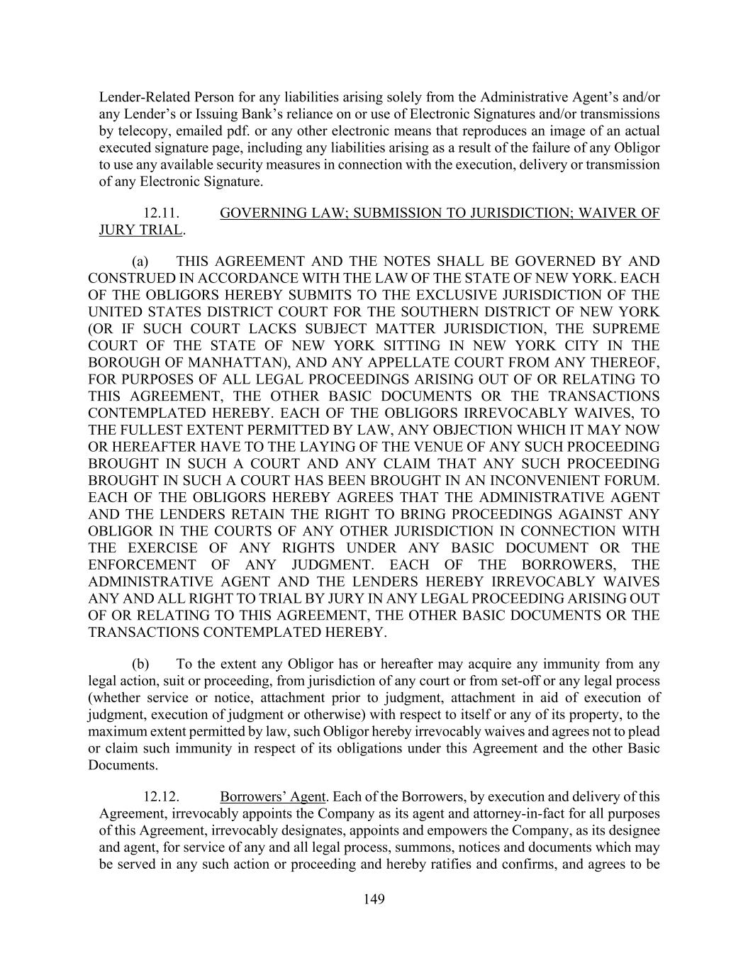 149与出借人有关的人,仅因行政代理人和/或任何贷款人或开证银行依赖或使用电子签名和/或通过电传、电子邮件pdf.或任何其他电子手段复制实际执行的签名页的图像而产生的任何责任,包括因任何义务人未能在执行、交付或传输任何电子签名时使用任何可用的安全措施而产生的任何责任。12.11.管辖法律;提交管辖权;放弃陪审团审判。(a)本协议及票据应由纽约州法律管辖并按其建造。特此,每一位义务人均向美国纽约南区地区法院的专属管辖权(或如果此类法院缺乏主题事项管辖权,则由设在曼哈顿堡纽约市的纽约州最高法院),以及来自其中任何一方的任何上诉法院,就产生于本协议或与本协议有关的所有法律程序而言,OOC每一位义务人在法律允许的最充分范围内,不可撤销地放弃其现在或以后可能对在该法院提出的任何此类诉讼的地点提出的任何异议,以及在该法院提出的任何此类诉讼已在不方便的论坛上提出的任何主张。每一义务人在此同意,行政代理人和出借人保留在任何其他司法管辖区的法院就行使任何基本文件下的任何权利或执行任何判决而对任何义务人提起诉讼的权利。每一位借款人、行政代理人和出借人在此不可撤销地放弃因本协议、其他基本文件或在此设想的交易而产生或与之有关的任何法律程序中由陪审团审判的任何和所有权利。(b)在法律允许的最大限度内,在任何义务人已经或以后可能就其本身或其任何财产获得免于任何法律诉讼、诉讼或程序、任何法院的司法管辖权或抵销或任何法律程序(不论是送达或通知、判决前的扣押、协助执行判决的扣押、判决的执行或其他)的范围内,该义务人在此不可撤销地放弃并同意不就其在本协议和其他基本文件下的义务提出抗辩或要求此类豁免。12.12.借款人的代理人。各借款方通过执行和交付本协议,为本协议的所有目的不可撤销地指定公司为其代理人和事实上的代理人,不可撤销地指定、指定和授权公司作为其指定人和代理人,以送达在任何该等诉讼或程序中可能送达的任何和所有法律程序、传票、通知和文件,并在此批准和确认,并同意为