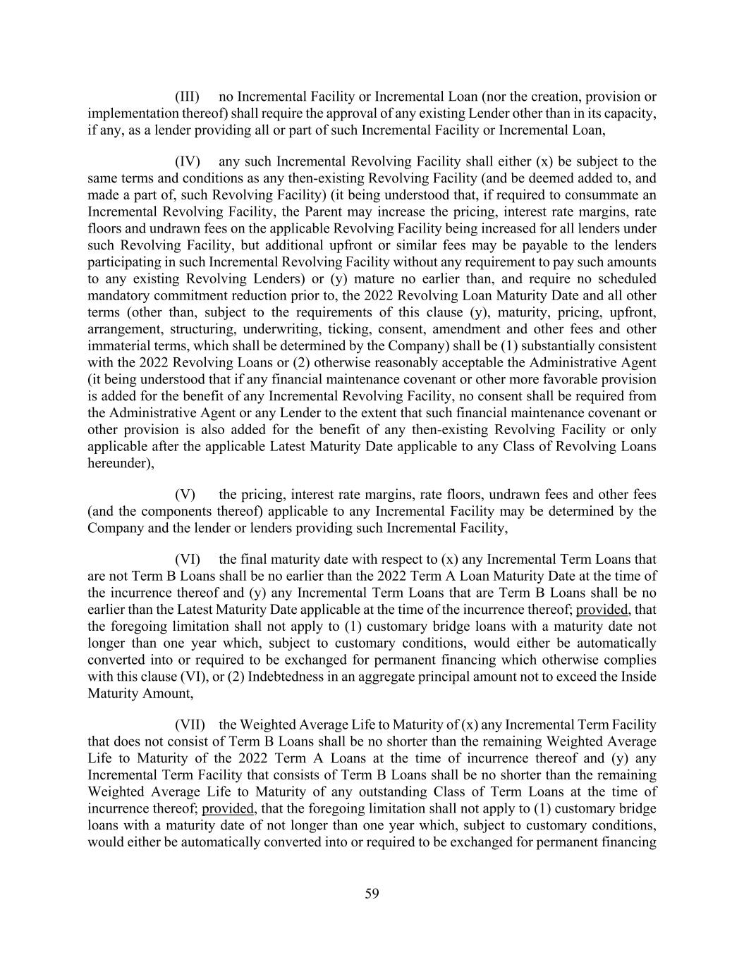 59(III)任何增量融资或增量贷款(或其创建、提供或实施)均不得要求任何现有贷款人的批准,但作为提供全部或部分此类增量融资或增量贷款的贷款人(如有),(IV)任何此类增量循环融资应遵守与任何当时存在的循环融资相同的条款和条件(并被视为添加到此类循环融资中并成为其一部分)(但有一项理解,如果需要完成增量循环融资,母公司可以提高定价,适用的循环贷款的利率差额、利率下限和未提取费用正在增加此类循环贷款下的所有贷款人,但可能需要向参与此类增量循环贷款的贷款人支付额外的预付款或类似费用,而无需向任何现有的循环贷款人支付此类金额)或(y)不早于2022年循环贷款到期日和所有其他条款(除根据本条款(y)的要求,期限、定价、预付款、安排、结构、承销、勾选、同意外,修正和其他费用及其他非实质性条款,由公司确定)应(1)与2022年循环贷款基本一致或(2)行政代理人在其他方面合理接受(据了解,如果为了任何增量循环融资的利益而增加任何财务维持契约或其他更有利的规定,如该等财务维持契约或其他条文亦为任何当时存在的循环贷款的利益而加入或仅适用于本协议下任何类别循环贷款所适用的最迟到期日之后),则无须征得行政代理人或任何贷款人的同意,(v)适用于任何增量贷款的定价、利率差额、利率下限、未提取费用及其他费用(及其组成部分)可由公司及提供该等增量贷款的一个或多个贷款人厘定,(六)(x)任何不属于B期贷款的增量定期贷款的最后到期日不早于发生时的2022年A期贷款到期日;(y)任何属于B期贷款的增量定期贷款的最后到期日不早于发生时适用的最后到期日;但前述限制不适用于(1)到期日不超过一年的惯常过桥贷款,在符合惯常条件的情况下,将被自动转换为或被要求交换为在其他情况下符合本第(VI)条的永久融资,或(2)本金总额不超过内部到期金额的债务,(七)(x)任何不由B期贷款组成的增量定期融资的到期加权平均年限,不得短于2022年A期贷款在发生时的到期加权平均年限;(y)任何由B期贷款组成的增量定期融资,不得短于任何未偿还类别定期贷款在发生时的到期加权平均年限;但,上述限制不适用于(1)到期日不超过一年的惯常过桥贷款,在符合惯常条件的情况下,这些贷款将自动转换为或被要求交换为永久融资