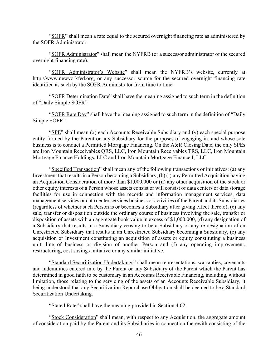 46“SOFR”是指与SOFR管理人管理的有担保隔夜融资利率相等的利率。“SOFR管理人”是指NYFRB(或担保隔夜融资利率的继任管理人)。“SOFR管理员的网站”是指NYFRB的网站,目前位于http://www.newyorkfed.org,或SOFR管理员不时确定的有担保隔夜融资利率的任何后续来源。“SOFR确定日期”应具有“每日简单SOFR”定义中赋予该术语的含义。“SOFR Rate Day”应具有“Daily Simple SOFR”定义中赋予该术语的含义。“SPE”是指(x)每个应收账款子公司和(y)母公司或任何子公司为从事目的而组成的每个特殊目的实体,其唯一业务是进行许可的抵押融资。A & R交割日,仅有的SPE为铁山应收款QRS,LLC,铁山应收款TRS,LLC,铁山 Mortgage Finance Holdings,LLC和铁山 Mortgage Finance I,LLC。“特定交易”是指以下任何交易或举措:(a)导致某人成为子公司的任何投资,(b)(i)收购对价超过1,000,000美元的任何许可收购,或(ii)对资产由或将由数据中心或数据存储设施组成的人的股票或其他股权的任何其他收购,用于记录和信息管理服务,母公司及其子公司的数据管理服务或数据中心服务业务或活动(无论该人是否是或在生效后成为子公司),(c)在正常业务过程之外的任何出售、转让或处置,涉及出售、转让或处置账面总价值超过1,000,000美元的资产,(d)任何导致子公司不再是子公司的子公司的指定,或导致非限制性子公司成为子公司的任何重新指定,(e)构成对构成另一人的业务单位、业务范围或部门的资产或股权的收购的任何收购或投资,以及(f)任何经营改善、重组、成本节约举措或任何类似举措。“标准证券化承诺”是指母公司或母公司的任何子公司在应收账款融资中善意认定为惯常的陈述、保证、契诺和赔偿,包括但不限于与应收账款子公司的资产提供服务有关的陈述、保证、契诺和赔偿,据了解,任何证券化回购义务应视为标准证券化承诺。“Stated Rate”应具有第4.02节规定的含义。“股票对价”是指,就任何收购而言,母公司及其子公司支付的与此相关的对价总额,其中包括