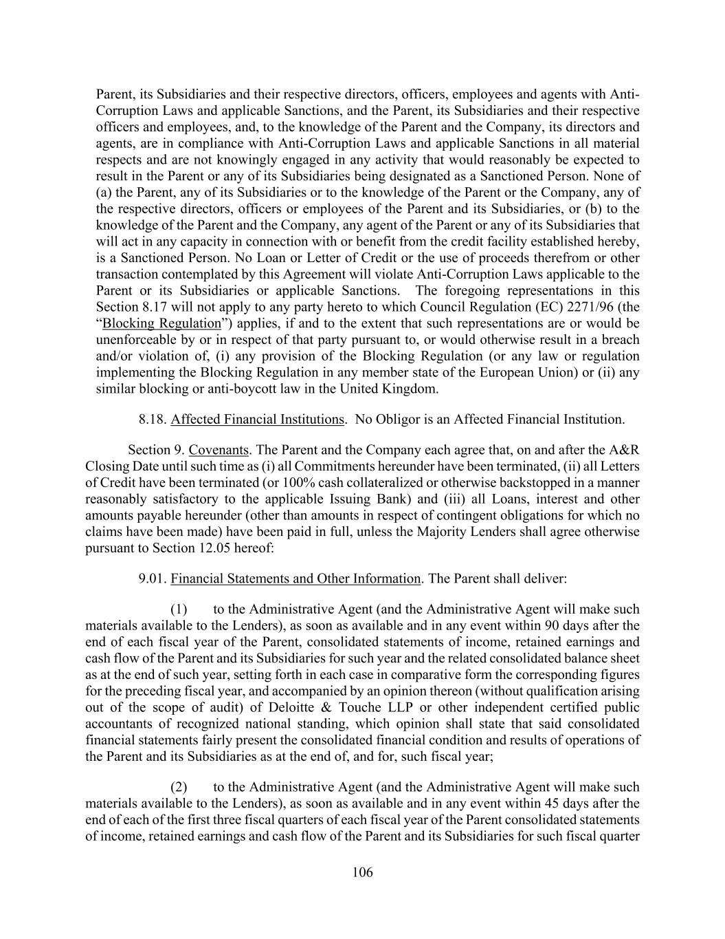106母公司、其子公司及其各自的董事、高级职员、雇员和受反腐败法和适用制裁的代理人,以及母公司、其子公司及其各自的高级职员和雇员,据母公司和公司、其董事和代理人所知,在所有重大方面均遵守反腐败法和适用制裁,并且没有在知情的情况下从事任何合理预期会导致母公司或其任何子公司被指定为受制裁人员的活动。(a)母公司、其任何附属公司或据母公司或公司所知,母公司及其附属公司各自的董事、高级职员或雇员,或(b)据母公司及公司所知,母公司或其任何附属公司的任何代理人将以任何身份就特此设立的信贷融资行事或从中受益,均不是受制裁的人。任何贷款或信用证或由此产生的收益的使用或本协议所设想的其他交易都不会违反适用于母公司或其子公司的反腐败法或适用的制裁。本第8.17条中的上述陈述将不适用于理事会条例(EC)2271/96(“封锁条例”)适用的任何一方,如果此类陈述是或将无法由该方根据或就该方而言无法执行,或将以其他方式导致违反和/或违反,(i)《封锁条例》的任何条款(或在欧洲联盟任何成员国实施《封锁条例》的任何法律或条例)或(ii)英国的任何类似的《封锁或反抵制法律》。8.18.影响了金融机构。没有债务人是受影响的金融机构。第9节。盟约。母公司和公司各自同意,在A & R截止日期及之后,直至(i)本协议项下的所有承诺均已终止,(ii)所有信用证均已终止(或以适用的开证银行合理满意的方式100%现金抵押或以其他方式支持),以及(iii)本协议项下的所有贷款、利息和其他应付金额(未提出索赔的或有债务的金额除外)均已全额支付,除非多数贷款人根据本协议第12.05节另有约定:9.01。财务报表和其他信息。母公司应:(1)向行政代理人(由行政代理人向贷款人提供此类材料),在母公司每个会计年度结束后的90天内尽快并无论如何在该年度母公司及其子公司的合并损益表、留存收益和现金流量表以及截至该年度末的相关合并资产负债表中,在每种情况下以比较形式列出上一个会计年度的相应数字,并附Deloitte & Touche LLP或其他具有公认国家地位的独立注册会计师的意见(不附带因审计范围而产生的保留意见),该意见应说明所述合并财务报表公允地反映了母公司及其子公司在该会计年度结束时和该会计年度结束时的合并财务状况和经营成果;(2)向行政代理人(由行政代理人向贷款人提供该等材料),母公司及其子公司在该财政季度的合并损益表、留存收益和现金流量表的每个财政年度的前三个财政季度结束后的45天内尽快并在任何情况下