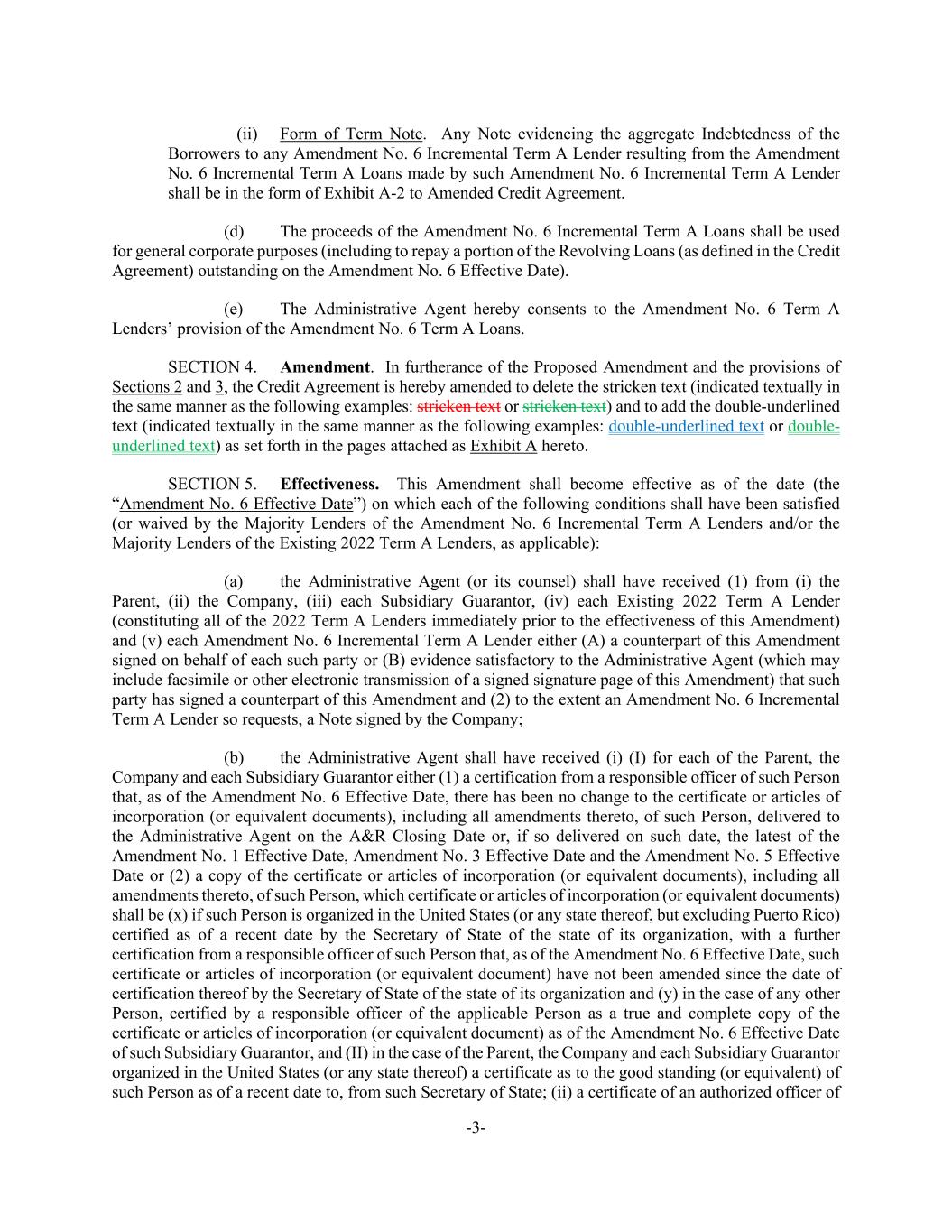-3-(ii)定期票据的形式。任何证明借款人对任何修订第6号增量期限A贷款人因该修订第6号增量期限A贷款而产生的总债务的票据,应采用经修订的信贷协议的附件 A-2的形式。(d)第6号修正案增量期限A贷款的收益应用于一般公司用途(包括偿还第6号修正案生效日期未偿还的部分循环贷款(定义见信贷协议))。(e)行政代理人特此同意第6号修正案A期贷款人对第6号修正案A期贷款的规定。第4节。修正。为推进拟议的修订以及第2节和第3节的规定,现对信用协议进行修订,以删除作为本协议所附网页中规定的双下划线文字(以与以下示例相同的方式以文字表示:双下划线文字或双下划线文字),并增加作为本协议所附附件 A的页面中规定的双下划线文字(以与以下示例相同的方式以文字表示:双下划线文字或双下划线文字)。第5节。有效性。本修订自下列各条件均已满足之日(“第6号修订生效日”)起生效(或经第6号修订的多数贷款人放弃增量期限A贷款人和/或现有2022年期限A贷款人的多数贷款人(如适用):(a)行政代理人(或其律师)应已收到(i)母公司、(ii)公司、(iii)各附属担保人的(1)、(iv)每个现有的2022年A期贷款人(构成紧接本修订生效前的所有2022年A期贷款人)及(v)每项修订第6号增量期限贷款人(a)代表每一该等当事人签署的本修订对应方或(b)行政代理人信纳的证据(可包括本修订的已签署签字页的传真或其他电子传送),证明该方已签署本修订的对应方,以及(2)在贷款人要求的第6号增量期限范围内,a由公司签署的说明;(b)行政代理人应已就母公司、公司及各附属公司担保人各自收到(i)(i)该人的负责人员出具的证明,证明截至第6号修正案生效日期,该人于A & R截止日期交付给行政代理人的证书或公司章程(或同等文件)(包括其所有修订)并无任何变更,如在该日期交付,则为第1号修正案生效日期的最晚日期,第3号修正案生效日期和第5号修正案生效日期或(2)该人的证书或公司章程(或同等文件)的副本,包括对其的所有修订,该证书或公司章程(或同等文件)应为(x),如果该人是在美国(或其任何州,但不包括波多黎各)组织的,并由该人的负责官员进一步证明,自第6号修正案生效日期起,该等证书或公司章程(或同等文件)自其组织所在州的国务秘书作出认证之日起未予修订,而(y)如属任何其他人,则由适用人的负责人员核证为该附属公司的第6号修订生效日期的证书或公司章程(或同等文件)的真实完整副本,而(II)如属母公司,本公司及各附属公司担保人于美国(或其任何州)组织一份有关该人在最近日期的良好信誉(或同等地位)的证明,以向该国务卿提供;(ii)一份获授权人员的证明