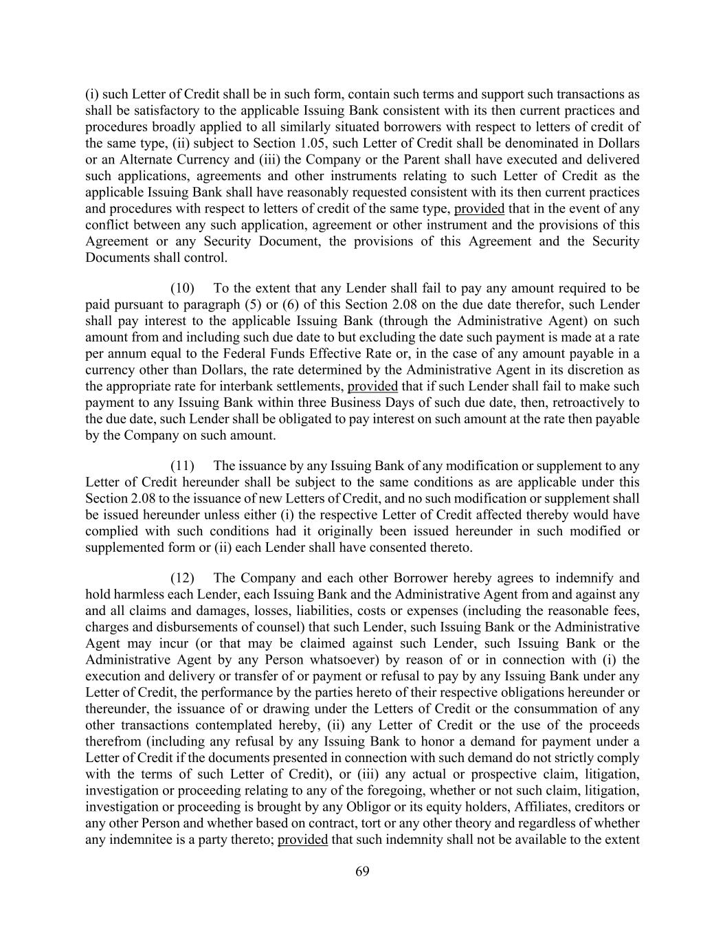 69(i)该信用证的格式、包含的条款和支持的交易应符合适用的开证银行当时就同类型信用证广泛适用于所有类似情况的借款人的现行做法和程序,(ii)在符合第1.05条的规定下,该信用证应以美元或替代货币计值,以及(iii)公司或母公司应已签署并交付该等申请,适用的开证银行应已根据其当时关于同类型信用证的现行做法和程序合理要求与此类信用证有关的协议和其他文书,但如任何此类申请、协议或其他文书与本协议或任何担保文件的规定发生任何冲突,则应以本协议和担保文件的规定为准。(10)如任何贷款人在到期日未能支付依据本条第(5)或(6)款规定须支付的任何款项,则该贷款人须(透过行政代理人)就该等款项向适用的开证银行支付利息,自(包括)该到期日起至但不包括该等款项支付之日止,其年利率相当于联邦基金实际利率,如属以美元以外的货币支付的任何款项,行政代理人酌情决定的利率,作为银行同业结算的适当利率,但如该贷款人未能在该到期日起三个营业日内向任何发行银行支付该款项,则追溯至到期日,该贷款人有义务按公司当时应就该金额支付的利率支付该金额的利息。(11)任何开证银行根据本协议对任何信用证作出任何修改或补充,须受根据本条第2.08条适用于签发新信用证的相同条件所规限,而不得根据本协议签发任何该等修改或补充,除非(i)受此影响的有关信用证如果最初是根据本协议以该修改或补充的形式签发,或(ii)每个贷款人均已同意,否则本协议将不符合该等条件。(12)公司与其他借款人特此同意,就该贷款人、该发行银行或该行政代理人可能招致(或可能向该贷款人提出索赔)的任何和所有索赔和损害、损失、责任、成本或开支(包括大律师的合理费用、收费和支出),向该贷款人、各发行银行和行政代理人作出赔偿并使其免受损害,该开证行或任何人的行政代理人)由于或与(i)任何开证行根据任何信用证执行及交付或转让或付款或拒绝付款、双方各自在本协议项下或根据本协议项下的义务的履行、根据信用证签发或提款或完成本协议所设想的任何其他交易有关,(ii)任何信用证或所得款项用途(包括任何开证银行拒绝根据信用证履行付款要求,但与该要求有关的单据并不严格遵守该信用证的条款),或(iii)任何与上述任何一项有关的实际或预期申索、诉讼、调查或法律程序,不论该等申索、诉讼、调查或法律程序是否由任何债务人或其权益持有人、关联公司、债权人或任何其他人提出,亦不论是否基于合约,侵权或任何其他理论,且不论任何受偿人是否为其当事人;但该等赔偿不得在