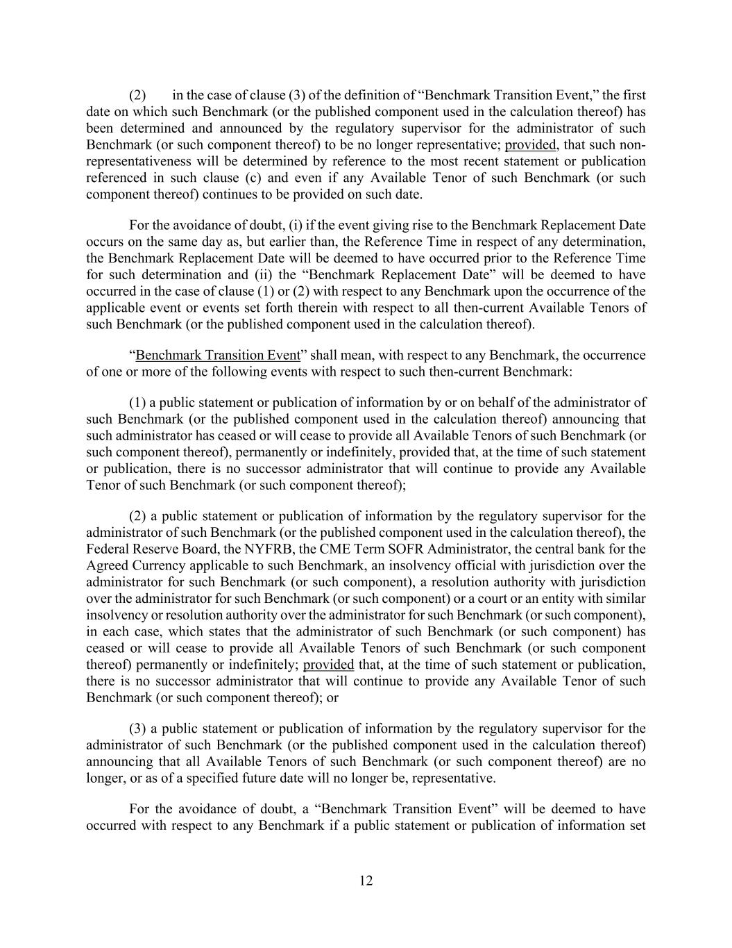 12(2)在“基准过渡事件”定义第(3)条的情况下,由监管主管确定并宣布该基准(或其计算中使用的已公布组成部分)的管理人不再具有代表性的第一个日期;但该等不代表性将通过参考该(c)条中提及的最近的声明或出版物来确定,即使在该日期继续提供该基准(或其此类组成部分)的任何可用期限。为免生疑问,(i)如导致基准更换日期的事件发生在与任何确定有关的参考时间的同一天,但早于该参考时间,基准更换日期将被视为发生在此种确定的参考时间之前,并且(ii)在第(1)或(2)条关于任何基准的情况下,在发生适用的事件或其中所述的关于该基准的所有当时可用期限(或计算该基准时使用的已公布组成部分)的事件时,将被视为发生了“基准更换日期”。“基准过渡事件”就任何基准而言系指就该当时的基准发生以下一项或多项事件:(1)由该基准管理人或代表该管理人(或计算该基准时使用的已公布组成部分)宣布该管理人已停止或将停止永久或无限期提供该基准(或其此类组成部分)的所有可用期限的公开声明或发布信息,但前提是,在该声明或发布时,没有继任管理人将继续提供此类基准(或其此类组成部分)的任何可用期限;(2)监管主管为此类基准(或其计算中使用的已公布组成部分)的管理人、联邦储备委员会、纽约联邦储备银行、CME术语SOFR管理人、适用于此类基准的商定货币的中央银行、对此类基准(或此类组成部分)的管理人具有管辖权的破产官员的公开声明或信息公布,对这类基准(或这类组成部分)的管理人具有管辖权的解决机构或对这类基准(或这类组成部分)的管理人具有类似破产或解决权限的法院或实体,在每种情况下均声明,这类基准(或这类组成部分)的管理人已停止或将停止永久或无限期地提供这类基准(或其这类组成部分)的所有可用期限;条件是,在这类声明或公布时,没有继任管理人将继续提供此类基准(或其此类组成部分)的任何可用期限;或(3)监管主管为此类基准(或其计算中使用的已发布组成部分)的管理人发表公开声明或公布信息,宣布此类基准(或其此类组成部分)的所有可用期限不再具有代表性,或截至未来指定日期将不再具有代表性。为免生疑问,如果公开声明或发布信息集,将被视为就任何基准发生了“基准转换事件”