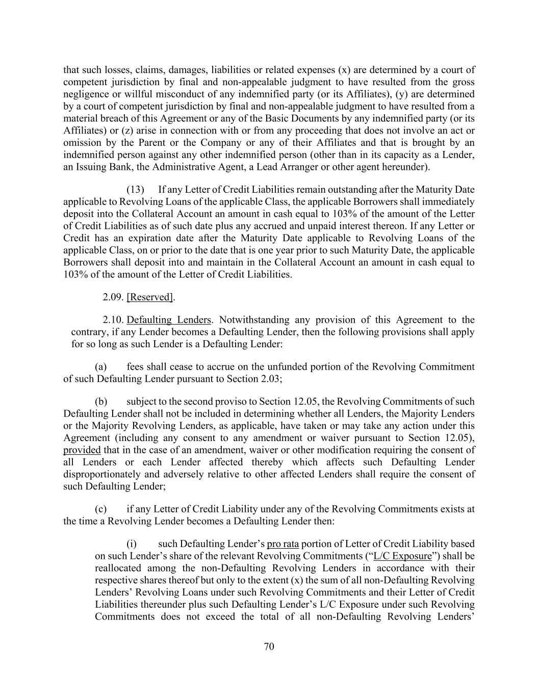 70此类损失、索赔、损害赔偿、责任或相关费用(x)由有管辖权的法院通过最终且不可上诉的判决确定为任何受赔偿方(或其关联公司)的重大过失或故意不当行为所致,(y)由有管辖权的法院以最终且不可上诉的判决裁定,是由于任何获弥偿方(或其联属公司)严重违反本协议或任何基本文件所致,或(z)产生于与任何法律程序有关或不涉及母公司或公司或其任何联属公司的作为或不作为,而该法律程序是由获弥偿人针对任何其他获弥偿人(其作为贷款人、发行银行、行政代理人的身份除外,a牵头安排人或本协议项下的其他代理人)。(13)如任何信用证负债在适用于适用类别的循环贷款的到期日之后仍未清偿,则适用的借款人须立即将相当于截至该日期的信用证负债金额的103%加上任何应计及未付利息的现金金额存入抵押账户。如任何信用证或信用证在适用类别的循环贷款所适用的到期日之后,在该到期日之前一年的日期或之前有一个到期日,则适用的借款人应将相当于信用证负债金额103%的现金金额存入抵押账户并在抵押账户中维持。2.09.[保留]。2.10.违约贷款人。尽管本协议有任何相反的规定,如果任何贷款人成为违约贷款人,那么只要该贷款人是违约贷款人,则以下规定应适用:(a)根据第2.03条,该违约贷款人的循环承诺的未提供资金部分应停止产生费用;(b)在符合第12.05条第二项但书的情况下,该违约贷款人的循环承诺不应包括在确定是否所有贷款人、多数贷款人或多数循环贷款人(如适用),已根据本协议采取或可能采取任何行动(包括根据第12.05条同意任何修订或放弃),但如属修订,要求所有贷款人或受其影响的每个贷款人同意的豁免或其他修改,如果对该违约贷款人产生不成比例的不利影响,相对于其他受影响的贷款人,则应要求该违约贷款人的同意;(c)如果任何循环承诺项下的任何信用证责任在循环贷款人成为违约贷款人时存在,那么:(i)该违约贷款人根据该贷款人在相关循环承诺中所占份额(“信用证风险敞口”)按比例分配的信用证责任部分应在非违约循环贷款人之间按照其各自所占份额重新分配,但仅限于(x)所有非违约循环贷款人在该循环承诺下的循环贷款的总和及其在其项下的信用证负债加上该等违约贷款人在该等循环承诺下的信用证风险敞口不超过所有非违约循环贷款人的总