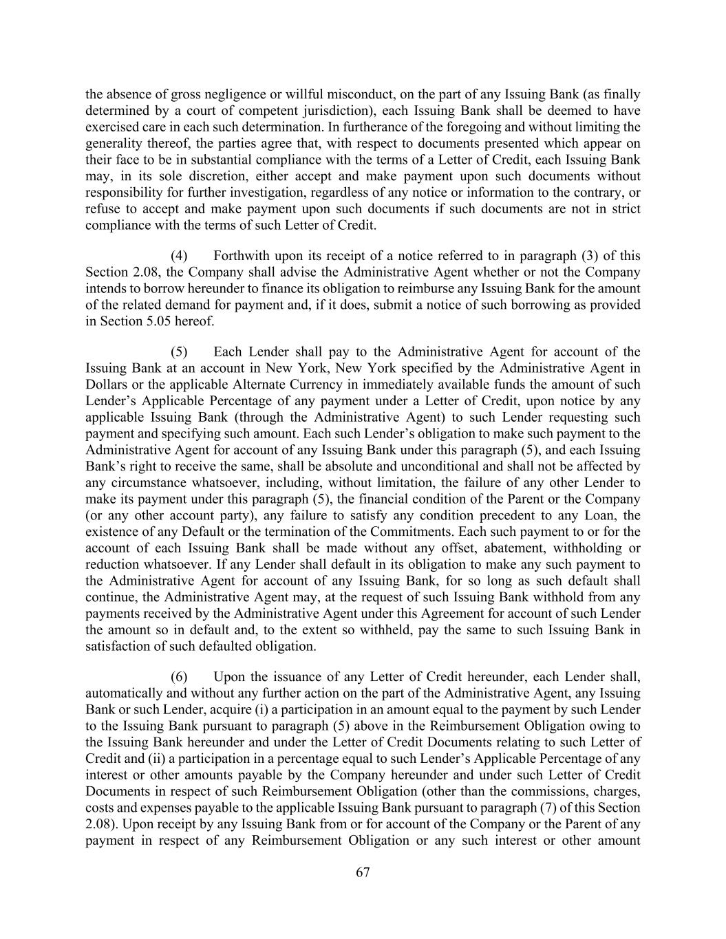 67对于不存在重大过失或故意不当行为的任何开证行(由有管辖权的法院最终裁定),每一开证行应被视为在每一次该等裁定中行使了谨慎。为促进上述规定,在不限制其概括性的情况下,各方当事人同意,对于表面上看来实质上符合信用证条款的单据,每一开证银行可全权酌情接受并支付该等单据的款项,而无须承担进一步调查的责任,无论是否有任何相反的通知或信息,或拒绝接受并支付该等单据的款项,如果该等单据不严格遵守该信用证的条款。(4)公司在接获本条第2.08条第(3)款所提述的通知后,须立即告知行政代理人公司是否有意根据本协议借款,以资助其偿还任何开证银行有关付款要求的金额的义务,如有,则须提交本协议第5.05条所规定的有关借款的通知。(5)在任何适用的开证银行(通过行政代理人)向该贷款人发出要求支付该款项并指明该数额的通知后,每一贷款人应在该行政代理人指定的纽约、纽约账户上以美元或适用的备用货币以即时可用资金向该行政代理人支付该贷款人在信用证项下任何付款的适用百分比的数额。每名该等贷款人根据本款第(5)款向任何开证行账户的行政代理人支付该等款项的义务,以及每名开证行收取该等款项的权利,均属绝对无条件,不受任何情况的影响,包括但不限于任何其他贷款人未能根据本款第(5)款支付款项、母公司或公司(或任何其他账户方)的财务状况、任何贷款的任何先决条件未能满足、任何违约的存在或承诺的终止。向各开证行或为各开证行账户支付的每笔款项,不得进行任何冲减、代扣代缴或减持。任何贷款人如不履行其为任何开证行的账户向行政代理人支付任何该等款项的义务,只要该违约继续存在,行政代理人可应该开证行的请求,从行政代理人根据本协议收到的为该贷款人支付的任何款项中扣留如此违约的金额,并在如此扣留的范围内,向该开证行支付相同的款项,以清偿该违约义务。(6)在根据本协议签发任何信用证时,每一贷款人应自动且无需行政代理人、任何开证银行或该贷款人采取任何进一步行动,取得(i)参与相当于该贷款人根据上文第(5)款向开证银行支付的根据本协议和根据与该信用证有关的信用证单据欠开证银行的偿付义务的金额,以及(ii)参与相当于该贷款人在公司根据本协议和根据该信用证单据就该偿付义务应付的任何利息或其他金额的适用百分比的百分比(佣金、费用、根据本节第2.08条第(7)款应支付给适用的开证银行的成本和费用)。任何发行银行自公司或母公司收到或为公司或母公司的账户收到任何有关任何偿付义务或任何该等利息或其他金额的付款后