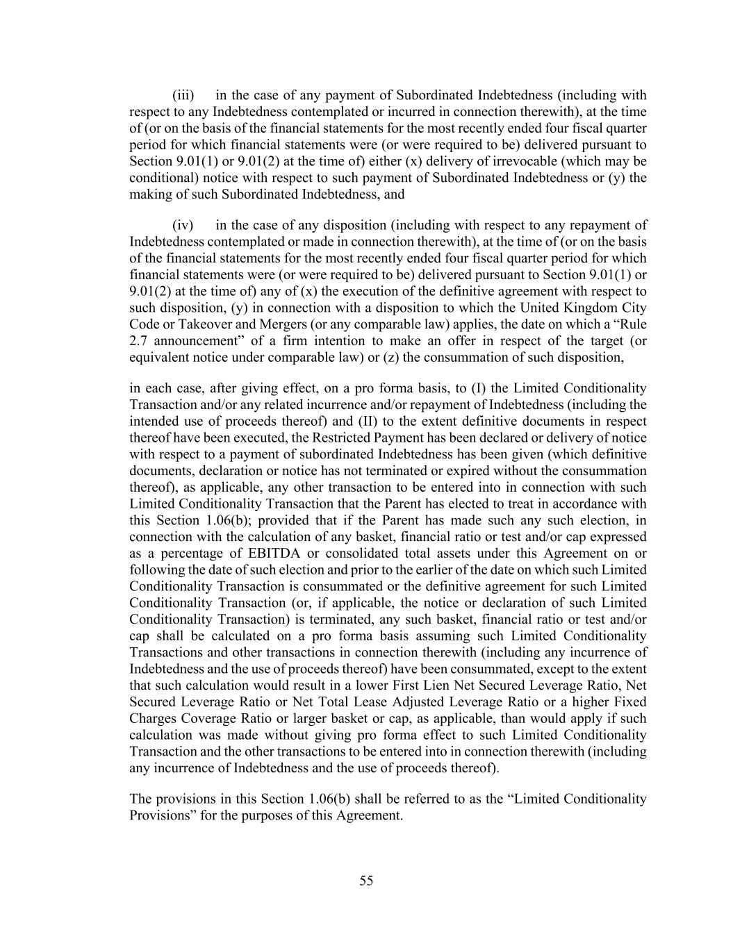 55(iii)就任何次级债务的支付(包括就与此有关的任何预期或招致的债务)而言,在(或根据根据根据第9.01(1)或9.01(2)条交付财务报表的最近结束的四个财政季度期间的财务报表(或当时要求)(x)就该等次级债务的支付交付不可撤销(可能是有条件的)通知或(y)作出该等次级债务时,及(iv)就任何处分(包括就预期或与之有关的任何偿还债项)而言,在(或根据根据根据第9.01(1)或9.01(2)条交付财务报表的最近结束的四个财政季度期间的财务报表而根据(x)任何有关该处分的最终协议的执行时,(y)就适用《英国城市守则》或《收购与合并》(或任何类似法律)的处置而言,就目标提出要约的坚定意向的“规则2.7公告”(或根据类似法律的同等通知)或(z)完成该处置的日期,在每种情况下,在生效后,在形式上,向(i)有限条件交易及/或任何相关产生及/或偿还债务(包括其所得款项的预期用途)及(II)在有关的最终文件已获签立的范围内,已宣布限制性付款或已就次级债务的支付发出通知的交付(该等最终文件、声明或通知并未在未完成的情况下终止或失效)(如适用),将就该等有限条件交易订立的任何其他交易,而母公司已选择根据本条第1.06(b)款处理;但如母公司已作出该等任何该等选择,则在计算任何篮子、财务比率或测试及/或上限时,在该选择日期当日或之后,并在该等有限条件交易完成日期或该等有限条件交易的最终协议日期(或,如适用,此类有限条件交易的通知或声明)终止,任何此类篮子、财务比率或测试和/或上限应在假定此类有限条件交易和与此相关的其他交易(包括任何债务的发生及其收益的使用)已完成的情况下,在备考基础上计算,除非此类计算将导致较低的第一留置权净担保杠杆比率、净担保杠杆比率或净总租赁调整杠杆比率或较高的固定费用覆盖率或较大的篮子或上限(如适用),如果进行此类计算时未对此类有限条件交易以及与此相关的其他交易(包括任何债务的产生及其收益的使用)产生形式上的影响,则将适用。就本协议而言,本条第1.06(b)款的规定应称为“有限条件规定”。