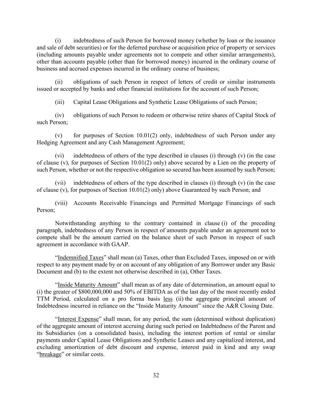 32(i)该人因借款(不论是通过贷款或发行及出售债务证券)或因物业或服务的递延购买或购置价格(包括根据不竞争协议和其他类似安排应付的金额)而产生的债务,除在正常业务过程中发生的应付账款(借入款项除外)及在正常业务过程中发生的应计费用外;(ii)该人就银行及其他金融机构为该人的帐户签发或接受的信用证或类似票据所承担的责任;(iii)该人的资本租赁义务和合成租赁义务;(iv)该人赎回或以其他方式清退该人股本份额的义务;(v)仅就第10.01(2)条而言,该等人在任何对冲协议及任何现金管理协议项下的债务;(vi)第(i)至(v)条所述类型的其他人的债务(就第(v)款而言,仅就上文第10.01(2)条而言)以该等人的财产上的留置权作担保,不论如此担保的相应债务是否已由该等人承担;(vii)第(i)至(v)条所述类型的其他人的债务(就第(v)款而言,仅就上述第10.01(2)条而言)由该人担保;及(viii)该人的应收账款融资及许可抵押融资;尽管上段第(i)款中有任何相反规定,任何人就根据不竞争协议应付的金额所欠的债务,应为该人根据公认会计原则就该协议在资产负债表上列示的金额。“补偿税款”是指(a)对任何借款人根据任何基本文件所承担的任何义务所支付的款项或因其承担的任何义务而征收或与之相关的税款(不包括的税款),以及(b)在(a)中未另有说明的范围内征收的其他税款。“内幕到期金额”是指截至任何确定日期,金额等于(i)截至最近结束的TTM期间最后一天的EBITDA的800,000,000美元和50%中的较高者,按备考基础计算减去(ii)自A & R截止日期以来依赖“内幕到期金额”产生的债务本金总额。“利息费用”是指,在任何期间,母公司及其子公司(在合并基础上)在该期间的债务产生的利息总额的总和(不重复确定),包括资本租赁义务和合成租赁项下的租金或类似付款的利息部分以及任何资本化的利息,不包括债务贴现和费用的摊销、以实物支付的利息以及任何掉期“断裂”或类似成本。