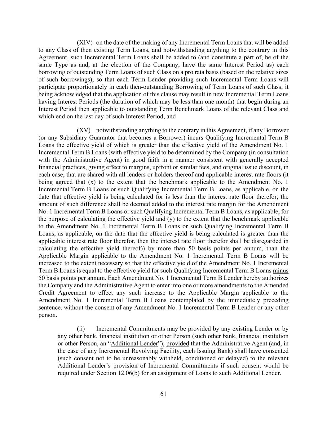 61(XIV)在作出任何增量定期贷款之日,该增量定期贷款将被添加到任何类别的当时现有定期贷款中,尽管本协议有任何相反规定,但该增量定期贷款应按比例(基于此类借款的相对规模)添加到此类类别的未偿还定期贷款的每笔借款中(并构成其中的一部分,与其类型相同,并经公司选择,具有与其相同的利息期),以便提供此类增量定期贷款的每个定期贷款人将按比例参与此类定期贷款的每次当时未偿还借款;确认本条款的适用可能会导致新的增量定期贷款的计息期(期限可能少于一个月)开始于当时适用于相关类别的未偿还定期基准贷款的计息期,并在该计息期的最后一天结束,并且(XV)尽管本协议有任何相反的规定,如任何借款人(或成为借款人的任何附属担保人)发生符合条件的增量B期贷款,其有效收益率高于修订第1号增量B期贷款的有效收益率(有效收益率由公司(与行政代理人协商)以符合公认财务惯例的方式善意确定,给予保证金、预付款或类似费用以及原始发行折扣,在每种情况下,与所有贷款人或其持有人共享的利率下限和适用的利率下限(同意(x)在计算有效收益率之日适用于修订第1号增量B期贷款或此类合格增量B期贷款(如适用)的基准低于其利率下限的范围内,该差额的金额应被视为添加到修订第1号增量B期贷款或此类合格增量B期贷款(如适用)的利率差中,为计算有效收益率和(y)在计算有效收益率之日适用于修订第1号增量B期贷款或此类合格增量B期贷款(如适用)的基准大于其适用的利率下限的范围内,则在计算其有效收益率时应忽略其利率下限))每年超过50个基点,超过适用于修订第1号增量B期贷款的适用保证金将增加到必要的程度,以使修订第1号增量B期贷款的有效收益率等于此类合格增量B期贷款的有效收益率减去每年50个基点。每份修订第1号增量期限B贷款人特此授权公司与行政代理人订立一项或多项修订经修订信贷协议,以实现对适用于紧接前一句所设想的修订第1号增量期限B贷款的适用保证金的任何此类增加,而无需征得任何修订第1号增量期限B贷款人或任何其他人的同意。(ii)增量承诺可由任何现有贷款人或任何其他银行、金融机构或其他人(该其他银行、金融机构或其他人,即“额外贷款人”)提供;但如根据第12.06(b)条向该额外贷款人转让贷款需要此种同意,则该行政代理人(以及在任何增量循环贷款的情况下,每一开证银行)应已同意(该同意不得被无理拒绝、附加条件或延迟)相关额外贷款人提供增量承诺。