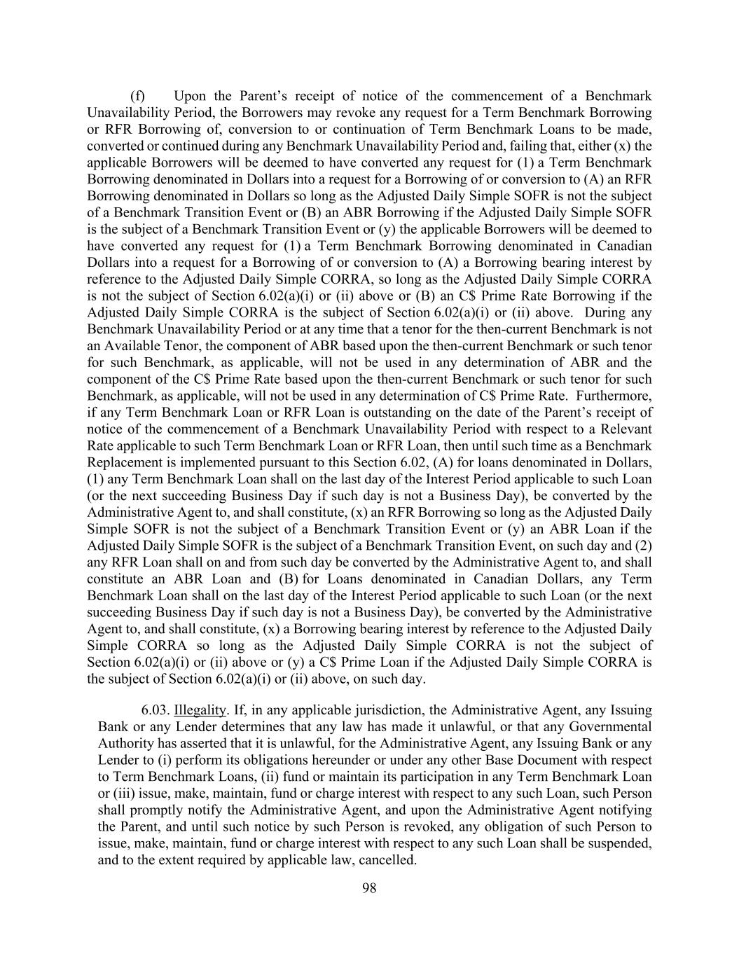 98(f)在母公司收到基准不可用期限开始的通知后,借款人可撤销任何在任何基准不可用期限内提出、转换为或延续定期基准贷款的定期基准借款或RFR借款请求,否则,(x)任一适用的借款人将被视为已将(1)以美元计价的定期基准借款的任何请求转换为以美元计价的RFR借款请求或转换为(a)以美元计价的RFR借款,只要调整后的每日简单SOFR不是基准过渡事件的主题或(b)ABR借款如果调整后的Daily Simple SOFR是基准转换事件的主题,或(y)适用的借款人将被视为已将(1)以加元计价的定期基准借款的任何请求转换为通过参考调整后的Daily Simple CORRA进行的借款请求或转换为(a)有利息的借款请求,只要调整后的Daily Simple CORRA不是上文第6.02(a)(i)或(ii)节的标的,或(b)如果调整后的Daily Simple CORRA是上文第6.02(a)(i)或(ii)节的标的,则为加元最优惠利率借款。在任何基准不可用期间或在当时的基准的期限不是可用期限的任何时候,基于当时的基准的ABR组成部分或此类基准的此类期限(如适用)将不会用于ABR的任何确定,而基于当时的基准的加元最优惠利率的组成部分或此类基准的此类期限(如适用)将不会用于任何确定加元最优惠利率。此外,如果任何定期基准贷款或RFR贷款在母公司收到有关适用于该定期基准贷款或RFR贷款的相关利率的基准不可利用期开始的通知之日仍未偿还,则在根据本条第6.02条实施基准替换之前,(a)对于以美元计价的贷款,(1)任何定期基准贷款应在适用于该贷款的利息期的最后一天(如该日不是营业日,则为下一个营业日),由行政代理人转换为,并应构成(x)RFR借款,只要调整后的Daily Simple SOFR不是基准转换事件的标的,或(y)ABR贷款,如果调整后的Daily Simple SOFR是基准转换事件的标的,则在该日和(2)任何RFR贷款应由行政代理人在该日和之后转换为,并应构成ABR贷款和(b)以加元计价的贷款,任何定期基准贷款应在适用于该贷款的利息期的最后一天(或下一个营业日,如果该日不是营业日),由行政代理人转换为,并应构成:(x)参照调整后的Daily Simple CORRA计息的借款,只要调整后的Daily Simple CORRA不是上述第6.02(a)(i)或(ii)节的标的,或(y)在该日,如果调整后的Daily Simple CORRA是上述第6.02(a)(i)或(ii)节的标的,则为(y)加元优质贷款。6.03.违法。如在任何适用法域内,行政代理人、任何发行银行或任何贷款人确定任何法律规定其为非法,或任何政府当局声称其为非法,则行政代理人、任何发行银行或任何贷款人(i)履行其根据本协议或根据任何其他基本文件就定期基准贷款承担的义务,(ii)资助或维持其参与任何定期基准贷款,或(iii)就任何该等贷款发行、作出、维持、资助或收取利息,该等人应迅速通知行政代理人,及在行政代理人通知家长后,直至该人的该通知被撤销,该人就任何该等贷款发行、作出、维持、资助或收取利息的任何义务应予中止,并在适用法律要求的范围内予以取消。