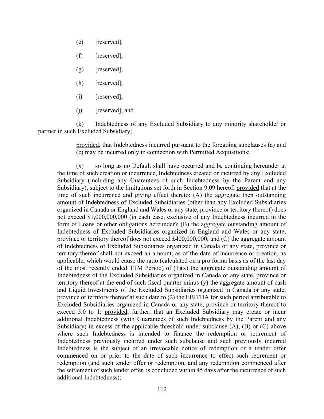 112(e)[保留];(f)[保留];(g)[保留];(h)[保留];(i)[保留];(j)[保留];(k)任何被排除的附属公司对该被排除的附属公司的任何少数股东或合伙人的债务;但根据上述(a)和(c)款产生的债务可能仅与允许的收购有关;(x)只要在此类创建或发生时没有发生违约并且仍在继续,任何被排除的附属公司产生或招致的债务(包括母公司和任何附属公司对此类债务的任何担保),受本协议第9.09节规定的限制;条件是在发生这种情况并使其生效时:(a)被排除在外的子公司(在加拿大或英格兰和威尔士或其任何州、省或地区组织的任何被排除的子公司除外)当时的未偿债务总额不超过1,000,000,000美元(在每种情况下,不包括以贷款或本协议项下其他义务的形式发生的任何债务);(b)在英格兰和威尔士或任何州组织的被排除的子公司的未偿债务总额,其所在省或地区不超过400,000,000英镑;(c)在加拿大或其任何州、省或地区组织的被排除在外的子公司的债务总额不得超过截至发生或创建之日(如适用)的金额,这将导致(1)(x)在加拿大或其任何州组织的被排除在外的子公司的未偿债务总额的比率(截至最近结束的TTM期间的最后一天按备考基础计算),在该财政季度末的省或地区减去(y)在该日期在加拿大或其任何州、省或地区组织的被排除子公司的现金和流动投资总额至(2)在该期间归属于在加拿大或其任何州、省或地区组织的被排除子公司的EBITDA超过5.0至1;此外,前提是被排除的子公司可能会产生或产生超过(a)款下适用阈值的额外债务(由母公司和任何子公司为此类债务提供担保),(b)或(c)以上,凡该等债务旨在为先前根据该款招致的债务的赎回或退还提供资金,而该等先前招致的债务是在发生该等债务的日期或之前开始的不可撤销赎回通知或要约的标的,以实现该等退还或赎回(而该等要约收购或赎回,以及在该等要约收购结算后开始的任何赎回,均在该等额外债务发生后45天内完成);