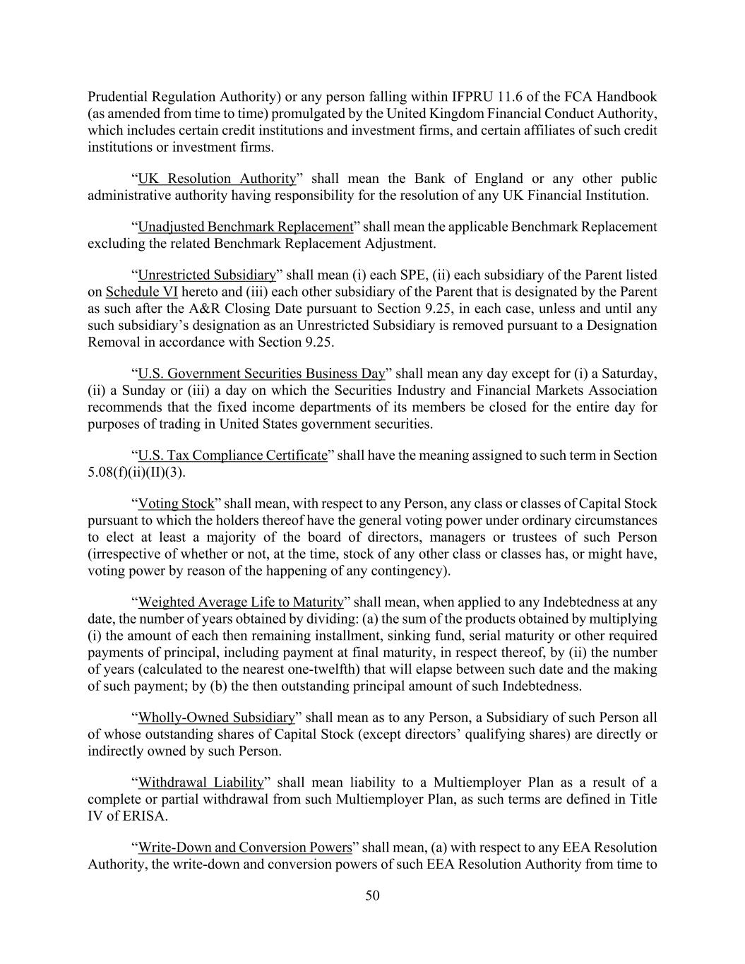 50 Prudential Regulation Authority)或属于英国金融行为监管局颁布的《FCA手册》(经不时修订)IFPRU11.6范围内的任何人,其中包括某些信贷机构和投资公司,以及此类信贷机构或投资公司的某些关联公司。“英国决议当局”是指英国央行或任何其他公共行政当局,对任何英国金融机构的决议负有责任。“未调整基准更换”是指不包括相关基准更换调整的适用基准更换。“非限制性子公司”是指(i)每个SPE,(ii)本协议附表VI所列的母公司的每个子公司,以及(iii)母公司根据第9.25条在A & R截止日期后指定为此类子公司的其他子公司,在每种情况下,除非并直到根据第9.25条的指定移除将任何此类子公司指定为非限制性子公司。“美国政府证券营业日”是指除(i)周六、(ii)周日或(iii)证券业和金融市场协会建议其成员的固定收益部门全天因美国政府证券交易而关闭的任何一天外的任何一天。“美国税务合规证明”应具有第5.08(f)(ii)(II)(3)节赋予该术语的含义。“有表决权股票”就任何人而言是指任何类别或类别的股本,据此,其持有人在一般情况下拥有一般投票权,以选举该人的董事会、经理或受托人至少过半数(无论当时任何其他类别或类别的股票是否因任何或有事项的发生而拥有或可能拥有投票权)。“加权平均到期期限”系指,当适用于任何日期的任何债务时,所获得的年限除以:(a)所获得的产品的总和,乘以(i)每一期当时剩余的分期付款、偿债基金、连续到期或其他所需的本金付款(包括最终到期的付款)的金额,再乘以(ii)从该日期到支付该款项之间将经过的年数(以最接近的十二分之一计算);乘以(b)该债务当时未偿还的本金金额。“全资附属公司”是指就任何人而言,该人的附属公司,其所有已发行股本股份(董事合资格股份除外)均由该人直接或间接拥有。“退出责任”是指由于完全或部分退出多雇主计划而对多雇主计划承担的责任,这些术语在ERISA标题IV中定义。“减记和转换权力”是指,(a)就任何EEA决议授权而言,该EEA决议授权的减记和转换权力不时至