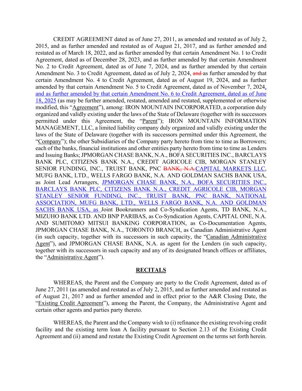 截至2011年6月27日的信贷协议,截至2015年7月2日经修订和重述,截至2017年8月21日经进一步修订和重述,截至2022年3月18日经进一步修订和重述,并经截至2023年12月28日的信贷协议第1号修订进一步修订,以及截至2024年6月7日的信贷协议第2号修订进一步修订,以及截至2024年7月2日的信贷协议第3号修订进一步修订,以及经日期为2024年8月19日的信贷协议第4号修订进一步修订,以及经日期为2024年11月7日的信贷协议第5号修订进一步修订,以及经日期为2025年6月18日的信贷协议第6号修订进一步修订(可进一步修订、重述、修订和重述、补充或以其他方式修改,本“协议”),其中:IRON MOUNTAIN INCORPORATed,一家根据特拉华州法律正式组建并有效存在的公司(连同本协议允许的继任者,“母公司”);IRON MONTAIN INFORMATION MAGEMENT,LLC,一家根据美国特拉华州法律正式组建并有效存续的有限责任公司(连同本协议允许的继任者,“公司”);公司不时作为借款人加入本协议的其他附属公司;各银行、金融机构及不时作为贷款人和发行银行加入本协议的其他实体;JPMorgan CHASE BANK,N.A.、BOFA SECURITIES INC.、BARCLAYS BANK PLC、CITIZENS BANK N.A.、CREDIT AGRICOLE CIB、MORGAN STANLEY SENIOR Funding,INC.、TRUIST BANKWells Fargo Bank,N.A.和GOLDMAN SACHS BANK USA作为联席牵头安排人,JPMorgan CHASE BANK,N.A.、BOFA SECURITIES INC.、BARCLAYS BANK PLC、CITIZENS BANK N.A.、Credit Agricole CIB、MORGAN STANLEY SENIOR Funding,INC.、TRUIST BANK、PNC BANK,NATIONAL Association、MUFG BANK,LTD.、Wells Fargo BANK,N.A.和GOLDMAN SACHS BANK USA作为联席账簿管理人和联席银团AgAgA法国巴黎银行作为联合银团代理,CAPITAL ONE,N.A.和SUMITOMO Mitsui BANKING CORPORATION作为联合文件代理,JPMorgan CHASE BANK,N.A. TORONTO BRANCH作为加拿大行政代理人(以该身份,连同其继任者以该身份,“加拿大行政代理人”),JPMorgan CHASE BANK,N.A.作为贷款人的代理人(以该身份,连同其继任者以该身份及其任何指定的分支机构或关联机构,“行政代理人”)。RECITALS WHEREAS,the parent and the company are a parties of the credit agreement,date on June 27,2011(as revised and restated as of July 2,2015,and further revised and restated as of August 21,2017 and further revised and effective before the A & R closing date,the“existing credit agreement”),among the parent,the company,the administrative agent and the certain other agents and parties of the parties of the June 27,2011. The credit agreement(经修订和重述截至2015年7月2日,以及经进一步修订和重述于然而,母公司和公司希望(i)根据现有信贷协议第2.13节为现有循环信贷融资和现有定期贷款A融资再融资,以及(ii)根据此处规定的条款修订和重申现有信贷协议。