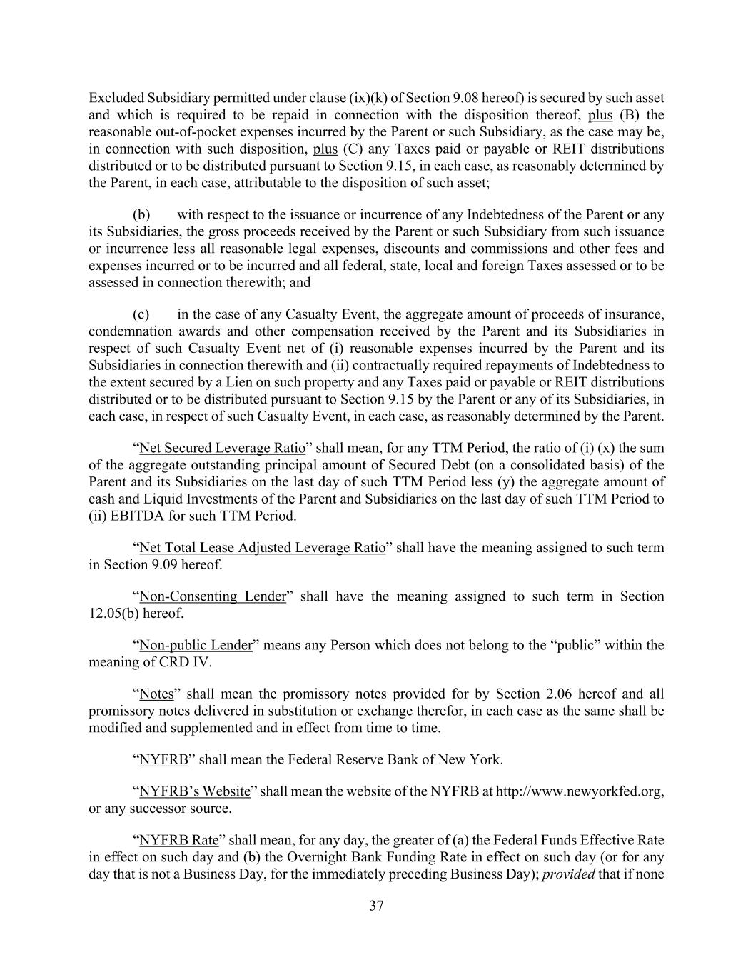 37本条例第9.08条第(ix)(k)款所允许的除外附属公司)由该等资产作担保,而该等资产须就该等资产的处分予以偿还,加上(b)母公司或该附属公司(视属何情况而定)就该等处分而招致的合理自付费用,加上(c)根据第9.15条所分派或将予分派的任何已付或应付税款或REIT分派,在每宗个案中,由母公司合理厘定,(b)就母公司或其任何子公司的任何债务的发行或发生而言,母公司或该子公司从该发行或发生中获得的总收益减去所有合理的法律费用、折扣和佣金以及已发生或将发生的其他费用和开支,以及与此相关的所有评估或将评估的联邦、州、地方和外国税收;(c)就任何伤亡事件而言,保险收益总额,母公司及其子公司就该伤亡事件收到的谴责裁决和其他赔偿,扣除(i)母公司及其子公司与此相关的合理费用和(ii)合同要求偿还的债务,但以对该财产的留置权以及母公司或其任何子公司根据第9.15条已支付或应付的任何税款或已分配或将分配的REIT分配为担保,在每种情况下,就该伤亡事件而言,在每种情况下,由母公司合理确定。“净有担保杠杆率”是指,就任何TTM期间而言,(i)(x)母公司及其子公司在该TTM期间最后一天的有担保债务(以综合基准计算)的未偿本金总额之和减去(y)母公司及子公司在该TTM期间最后一天的现金和流动性投资总额与(ii)该期间EBITDA的比率。“净总租赁调整后杠杆率”应具有本协议第9.09节赋予该术语的含义。“非同意贷款人”应具有本协议第12.05(b)节赋予该术语的含义。“非公出借人”是指任何不属于CRD IV含义内“公众”的人。“票据”是指本协议第2.06条规定的承兑票据以及作为替代或交换而交付的所有承兑票据,在每种情况下,均应予以修改和补充,并不时生效。“NYFRB”是指纽约联邦储备银行。“NYFRB的网站”是指NYFRB的网站http://www.newyorkfed.org,或任何后续来源。“NYFRB利率”是指,在任何一天,(a)在该日有效的联邦基金有效利率和(b)在该日有效的隔夜银行资金利率(或非营业日的任何一天,就紧接的前一个营业日而言)中的较大者;但前提是,如果没有