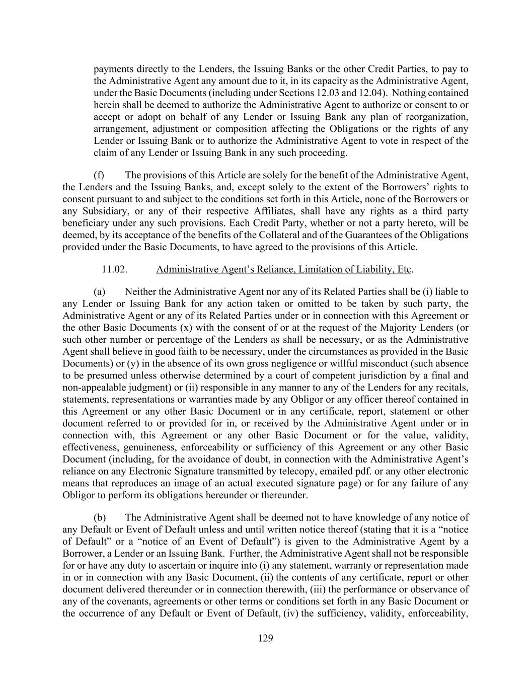 129直接向贷款人、开证银行或其他信贷当事人付款,以其作为行政代理人的身份,根据基本文件(包括根据第12.03和12.04条)向行政代理人支付应付给它的任何款项。本协议不得视为授权行政代理人授权或同意或代表任何贷款人或开证行接受或采纳影响任何贷款人或开证行的义务或权利的任何重组、安排、调整或组合计划,或授权行政代理人在任何该等程序中就任何贷款人或开证行的债权进行表决。(f)本条规定仅为行政代理人、贷款人和开证银行的利益服务,除仅限于借款人根据本条规定的条件并受其约束的同意权外,借款人或任何附属机构或其各自的任何关联机构均不享有任何此类规定下的作为第三方受益人的任何权利。每一信用方,无论是否为本合同的一方,通过其接受担保物的利益和基本单证项下所提供义务的担保,将被视为已同意本条的规定。11.02.行政代理人的依赖、责任限制等(a)行政代理人或其任何关联方均不得(i)对任何贷款人或开证行根据本协议或其他基本文件(x)采取或不采取的任何行动,在多数贷款人同意或应多数贷款人(或必要的其他贷款人数量或百分比)的要求下,对该当事人、行政代理人或其任何关联方承担责任,或作为行政代理人,在基本文件所规定的情况下,或(y)在其本身并无重大过失或故意不当行为的情况下(除非有管辖权的法院以最终和不可上诉的判决另有裁定,否则不得推定该缺席),或(ii)以任何方式对任何贷款人对本协议或任何其他基本文件或任何证书、报告所载的任何债务人或其任何高级人员作出的任何陈述、陈述、陈述或保证负责,行政代理人根据本协议或任何其他基本文件或与本协议或任何其他基本文件或与本协议或任何其他基本文件或与本协议或任何其他基本文件有关的价值、有效性、有效性、真实性、可执行性或充分性(为免生疑问,包括与行政代理人依赖任何通过电传、通过电子邮件发送的pdf或任何其他电子方式复制实际已签署的签字页的图像有关的任何电子签署)或任何义务人未能履行其在本协议项下或与本协议项下的义务有关的声明或其他文件。(b)除非借款人、贷款人或开证银行向行政代理人发出有关任何违约或违约事件的书面通知(述明该通知为“违约通知”或“违约事件通知”),否则行政代理人应被视为不知悉任何违约或违约事件的通知。此外,行政代理人无须负责或有任何责任查明或查询(i)在任何基本文件中作出或与之有关的任何陈述、保证或陈述,(ii)根据该文件交付或与之有关的任何证书、报告或其他文件的内容,(iii)任何基本文件所载的任何契诺、协议或其他条款或条件的履行或遵守,或任何违约或违约事件的发生,(iv)充分性、有效性、可执行性,