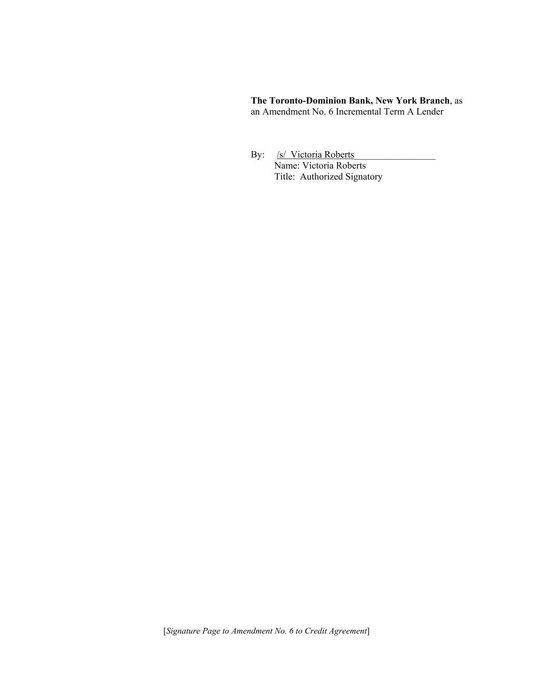 【信贷协议第6号修正案签署页】多伦多道明银行纽约分行作为第6号修正案增量期限贷款人:/s/Victoria Roberts ______________姓名:Victoria Roberts职务:授权签字人