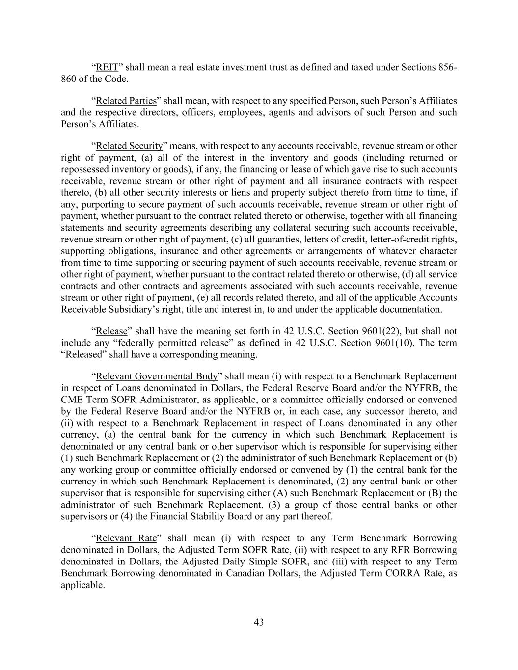43“REIT”是指根据《守则》第856-860条定义并征税的房地产投资信托。“关联方”是指,就任何特定人士而言,该人士的关联公司以及该人士及其关联公司各自的董事、高级职员、雇员、代理人和顾问。“相关担保”是指,就任何应收账款、收入流或其他受付权而言,(a)存货和货物的所有利息(包括退回或收回的存货或货物)(如有),其融资或租赁产生了此类应收账款、收入流或其他受付权以及与此相关的所有保险合同,(b)所有其他担保权益或留置权以及不时受其约束的财产(如有),旨在确保此类应收账款、收入流或其他受付权的支付,无论是否根据与此有关的合同,连同所有融资报表和担保协议,说明为此类应收账款、收入流或其他受付权提供担保的任何抵押品,(c)不时支持或担保此类应收账款、收入流或其他受付权的所有担保、信用证、信用证权利、支持义务、保险和其他任何性质的协议或安排,无论是否根据与此有关的合同或其他方式,(d)所有服务合同和与此类应收账款、收入流或其他受付权相关的其他合同和协议,(e)与之相关的所有记录,以及适用的应收账款附属公司在适用文件中、获得适用文件以及根据适用文件享有的所有权利、所有权和权益。“释放”应具有42 U.S.C.第9601(22)条中规定的含义,但不应包括42 U.S.C.第9601(10)条中定义的任何“联邦允许的释放”。发布”一词具有相应含义。“相关政府机构”系指(i)就以美元计价的贷款的基准替换而言,联邦储备委员会和/或NYFRB、适用的CME任期SOFR管理人,或由联邦储备委员会和/或NYFRB正式认可或召集的委员会,或在每种情况下,其任何继任者,以及(ii)就以任何其他货币计价的贷款的基准替换而言,(a)负责监督(1)该等基准更换所用货币的中央银行或负责监督(1)该等基准更换或(2)该等基准更换的管理人或(b)由(1)该等基准更换所用货币的中央银行正式认可或召集的任何工作组或委员会,(2)负责监督(a)该等基准更换或(b)该等基准更换的管理人的任何中央银行或其他监管机构,(3)这些中央银行或其他监管机构的一组或(4)金融稳定委员会或其任何部分。“相关利率”指(i)就任何以美元计价的定期基准借款而言,调整后的定期SOFR利率,(ii)就任何以美元计价的RFR借款而言,调整后的每日简单SOFR,以及(iii)就任何以加元计价的定期基准借款而言,调整后的定期CORRA利率(如适用)。