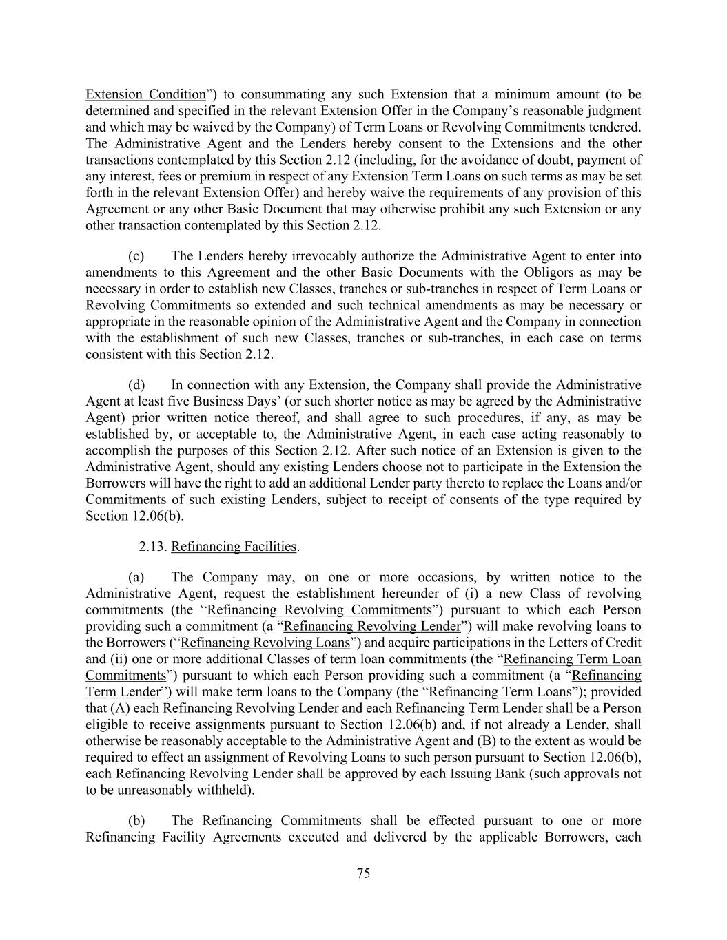 75延期条件”)以完成提交的定期贷款或循环承诺的最低金额(将在公司合理判断的相关延期要约中确定和规定,并可由公司豁免)的任何此类延期。行政代理人及贷款人特此同意本条2.12所设想的延期及其他交易(为免生疑问,包括按有关延期要约所载的条款支付与任何延期定期贷款有关的任何利息、费用或溢价),并特此放弃本协议或任何其他基本文件的任何条文的规定,而这些条文或任何其他基本文件可能会以其他方式禁止任何该等延期或本条2.12所设想的任何其他交易。(c)贷款人在此不可撤销地授权行政代理人与债务人订立本协议及其他基本文件的修订(视需要而定),以便就如此延长的定期贷款或循环承诺设立新的类别、批次或子档,以及行政代理人和公司合理认为与设立该等新类别、批次或子档有关的必要或适当的技术性修订,在每种情况下均按与本条2.12一致的条款。(d)就任何延期而言,公司须向行政代理人提供最少五个营业日的事先书面通知(或经行政代理人同意的较短通知),并须同意由行政代理人订立或可接受的程序(如有的话),在每宗个案中均须合理行事,以达到本条第2.12条的目的。在向行政代理人发出此类延期通知后,如果任何现有贷款人选择不参与延期,借款人将有权在其中增加一个额外的贷款方,以取代这些现有贷款人的贷款和/或承诺,但须收到第12.06(b)节要求的类型的同意。2.13.再融资设施。(a)公司可在一次或多次以书面通知行政代理人的方式,要求根据本协议建立(i)新类别的循环承诺(“再融资循环承诺”),据此,提供此类承诺的每个人(“再融资循环贷款人”)将向借款人提供循环贷款(“再融资循环贷款”)并获得参与信用证和(ii)一个或多个额外类别的定期贷款承诺(“再融资定期贷款承诺”),据此,提供此类承诺的每个人(“再融资定期贷款人”)将向公司提供定期贷款(“再融资定期贷款”);提供(a)每名再融资循环贷款人及每名再融资定期贷款人须为根据第12.06(b)条有资格接受转让的人,如并非已为贷款人,则须以其他方式为行政代理人合理接受,及(b)在根据第12.06(b)条向该人进行循环贷款转让所需的范围内,每名再融资循环贷款人须由各发行银行批准(该等批准不得无理拒绝)。(b)再融资承诺应根据适用的借款人签署和交付的一份或多份再融资便利协议进行,每一份