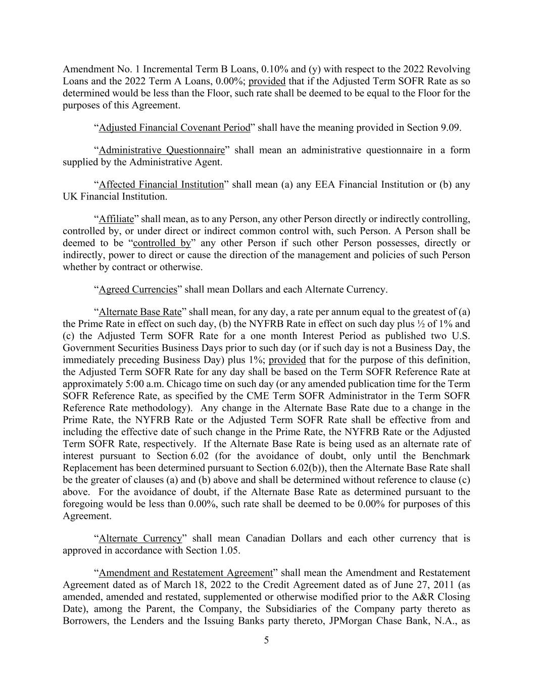 5第1号修正案增量B期贷款,就2022年循环贷款和2022年A期贷款而言为0.10%和(y),为0.00个百分点;但前提是,如果如此确定的调整后期限SOFR利率将低于下限,则就本协议而言,该利率应被视为等于下限。“调整后的财务契约期”应具有第9.09条规定的含义。“行政调查表”是指行政代理人提供的形式的行政调查表。“受影响金融机构”是指(a)任何欧洲经济区金融机构或(b)任何英国金融机构。“关联方”是指,就任何人而言,直接或间接控制、受其控制或与其直接或间接共同控制的任何其他人。如果任何其他人直接或间接拥有通过合同或其他方式指导或导致该人的管理和政策方向的权力,则该人应被视为“受”任何其他人“控制。“商定货币”是指美元和每一种替代货币。“替代基准利率”是指,就任何一天而言,每年的利率等于(a)在该日生效的最优惠利率、(b)在该日生效的NYFRB利率加上1%的½和(c)在该日之前两个美国政府证券营业日(或如果该日不是营业日,则为紧接前一个营业日)公布的一个月利息期的调整后期限SOFR利率加上1%中的最大值;但就本定义而言,任何一天的调整后期限SOFR利率应基于该日芝加哥时间上午5:00左右的期限SOFR参考利率(或期限SOFR参考利率的任何修订发布时间,由CME期限SOFR管理员在期限SOFR参考利率方法中规定)。由于最基本利率、NYFRB利率或调整后的期限SOFR利率的变化而导致的替代基本利率的任何变化应分别自并包括最基本利率、NYFRB利率或调整后的期限SOFR利率的此类变化生效之日起生效。如果根据第6.02条使用替代基准利率作为替代利率(为免生疑问,仅在根据第6.02(b)条确定基准替代之前),则替代基准利率应为上述(a)和(b)条中的较大者,应在不参考上述(c)条的情况下确定。为免生疑问,如根据上述规定厘定的替代基准利率将低于0.000%,则就本协议而言,该利率应视为0.000%。“替代货币”是指加元和根据第1.05节批准的其他货币。「修订及重述协议」系指截至二零一一年六月二十七日之信贷协议(经修订、修订及重述、补充或以其他方式于A & R截止日期前修订)之日期为二零二二年三月十八日之修订及重述协议,由母公司、公司、作为借款人的公司的附属公司、贷款人及作为借款人的发行银行、摩根大通 Bank,N.A.作为