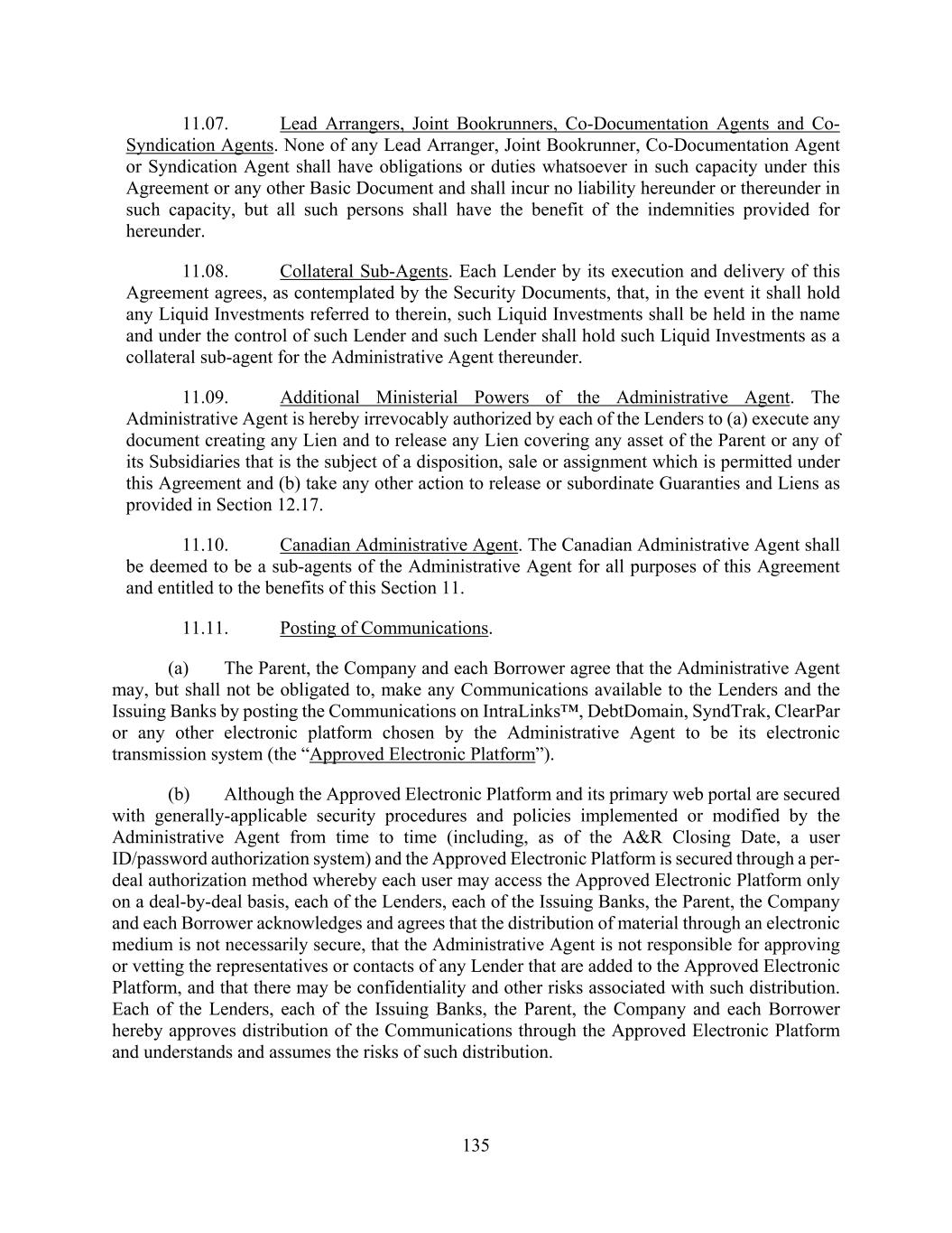 135 11.07.牵头安排人、联席账簿管理人、联合文件代理和联合银团代理。任何牵头安排人、联席账簿管理人、共同文件代理人或银团代理人均不应根据本协议或任何其他基本文件以该身份承担任何义务或义务,并且不应以该身份承担本协议项下或本协议项下的任何责任,但所有该等人均应受益于本协议项下规定的赔偿。11.08.担保子代理。每一贷款人通过其执行和交付本协议同意,如担保文件所设想的那样,在其应持有其中提及的任何流动性投资的情况下,该流动性投资应以该贷款人的名义持有并在其控制下,且该贷款人应持有该流动性投资作为其下行政代理人的担保子代理人。11.09.行政代理人的额外部长权力。行政代理人在此获各放款人不可撤销授权(a)签立任何产生任何留置权的文件,并解除涵盖母公司或其任何子公司的任何资产的任何留置权,该资产是本协议所允许的处置、出售或转让的标的,以及(b)采取任何其他行动解除或从属第12.17条规定的担保和留置权。11.10.加拿大行政代理人。就本协议的所有目的而言,加拿大行政代理人应被视为行政代理人的次级代理人,并有权享受本第11条的利益。11.11.通信的发布。(a)母公司、公司和每个借款人同意,行政代理人可以但无义务通过将通信张贴在IntraLinks上,向贷款人和发行银行提供任何通信™、DebtDomain、SyndTrak、ClearPar或行政代理人选择的任何其他电子平台作为其电子传输系统(“经批准的电子平台”)。(b)虽然经批准的电子平台及其主要网页门户以行政代理人不时实施或修改的普遍适用的安全程序和政策(包括截至A & R截止日期的用户ID/密码授权系统)作为担保,而经批准的电子平台则通过每笔交易授权方式作为担保,据此,每个用户只能在逐笔交易的基础上访问经批准的电子平台,但每个贷款人、每个发行银行、母公司,公司和每个借款人承认并同意,通过电子媒介分发材料不一定是安全的,行政代理人不负责批准或审查添加到已批准电子平台的任何贷款人的代表或联系人,并且可能存在与此种分发相关的保密和其他风险。各出借人、各发行银行、母公司、公司及各借款人特此批准通过经批准的电子平台分发通信,并了解并承担此类分发的风险。