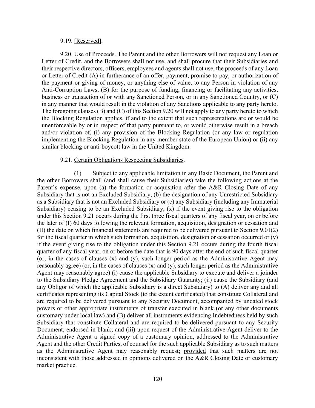 120 9.19.[保留]。9.20.收益用途。母公司和其他借款人将不会要求任何贷款或信用证,且借款人不得使用、并应促使其子公司及其各自的董事、高级职员、雇员和代理人不得将任何贷款或信用证的收益(a)用于促进向任何人违反任何反腐败法律的要约、付款、承诺付款或授权付款或给予金钱或任何其他有价值的东西,(b)用于资助、资助或促进任何活动的目的,与任何受制裁人员或与其进行的业务或交易,或在任何受制裁国家进行的业务或交易,或(c)以任何方式导致违反适用于本协议任何一方的任何制裁。本条第9.20条的前述(b)和(c)条将不适用于《封锁条例》所适用的任何一方,如果此类陈述是或将无法由该方根据或就该方而言无法执行,或将以其他方式导致违反和/或违反,(i)《封锁条例》的任何条款(或在欧洲联盟任何成员国实施《封锁条例》的任何法律或条例)或(ii)英国的任何类似的《封锁或反抵制法律》。9.21.有关附属公司的若干义务。(1)在任何基本文件中的任何适用限制的规限下,母公司和其他借款人应(并应促使其子公司)采取以下行动,费用由母公司承担,在(a)任何非排除子公司的A & R结束日期之后成立或收购,(b)任何非限制子公司被指定为非排除子公司的子公司或(c)任何子公司(包括任何非实质性子公司)不再是排除子公司时,(x)如引起根据本条第9.21条承担的义务的事件发生在任何财政年度的前三个财政季度,则在(i)有关成立、取得、指定或终止后60天及(ii)依据第9.01(2)条须交付财务报表的日期(以较后日期为准)或之前,而该财政季度发生该等成立、取得、指定或终止,或(y)如引起根据本条承担的义务的事件发生在任何财政年度的第四个财政季度,在该财政季度结束后90天(或在第(x)及(y)条的情况下,行政代理人合理同意的较长期限)的日期或之前(或在第(x)及(y)条的情况下,行政代理人可能合理同意的较长期限)(i)促使适用的附属公司签署并交付附属质押协议和附属担保的合并协议;(ii)促使附属公司(以及适用的附属公司为其直接附属公司的任何义务人)(a)交付构成抵押品且根据任何担保文件须交付的代表其股本的任何和所有凭证(在经证明的范围内),附有空白签署的未注明日期的股票权力或其他适当的转让文书(或当地法律下的任何其他习惯文件)和(b)交付该子公司持有的所有证明债务的文书,这些文书构成抵押品,根据任何担保文件必须交付,并以空白背书;(iii)应行政代理人的要求,向行政代理人交付一份签名的习惯意见副本,该意见是写给行政代理人和其他信用方的,就行政代理人可能合理要求的事项为此类适用的子公司提供法律顾问;前提是此类事项与在A & R截止日交付的意见或市场惯例中所述的内容不矛盾。