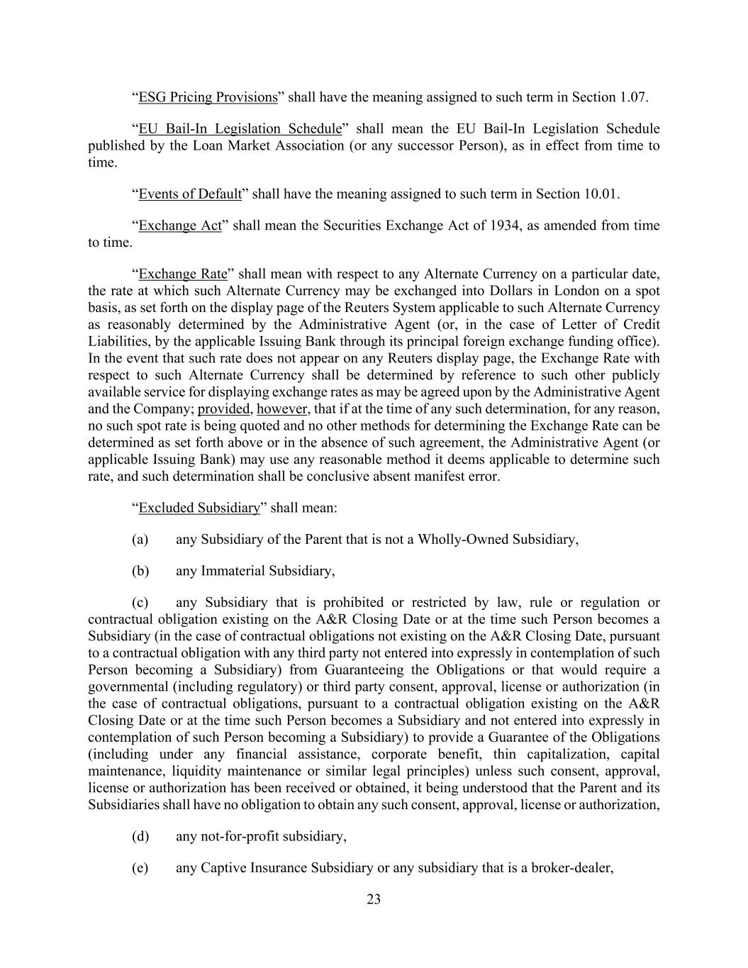 23“ESG定价条款”应具有第1.07节赋予该术语的含义。“欧盟纾困立法时间表”是指贷款市场协会(或任何继任者)公布的欧盟纾困立法时间表,不时生效。“违约事件”应具有第10.01条赋予该术语的含义。“交易法”是指经不时修订的1934年《证券交易法》。“汇率”是指就特定日期的任何替代货币而言,该等替代货币可以在伦敦以即期基础兑换成美元的汇率,如适用于由行政代理人(或在信用证负债的情况下,由适用的开证银行通过其主要外汇筹资办公室)合理确定的此类替代货币的路透系统展示页面所述。如果此类汇率未出现在任何路透显示页面上,则有关该替代货币的汇率应参照行政代理人与公司可能商定的其他可公开获得的用于显示汇率的服务确定;但前提是,如果在任何此类确定时,出于任何原因,没有报价此类即期汇率,并且无法按上述规定或在没有此类协议的情况下确定其他确定汇率的方法,行政代理人(或适用的开证行)可以采用其认为适用的任何合理方法确定该等费率,该确定为无明显错误的结论性确定。“被排除的子公司”是指:(a)母公司的任何非全资子公司的子公司,(b)任何非实质性子公司,(c)在A & R结束日或在该人成为子公司时存在的法律、规则或条例或合同义务禁止或限制的任何子公司(在A & R结束日不存在合同义务的情况下,根据与任何第三方的合同义务(未在考虑该人成为子公司时明确订立)提供担保的义务或需要政府(包括监管)或第三方同意、批准、许可或授权的义务(在合同义务的情况下,根据在A & R结束日期存在的合同义务或在该人成为子公司时存在且未在考虑该人成为子公司时明确订立的合同义务)提供担保的义务(包括在任何财务援助、公司利益、资本单薄、资本维持,流动性维持或类似的法律原则)除非已收到或获得此类同意、批准、许可或授权,但据了解,母公司及其子公司没有义务获得任何此类同意、批准、许可或授权,(d)任何非营利子公司,(e)任何专属保险子公司或任何作为经纪自营商的子公司,