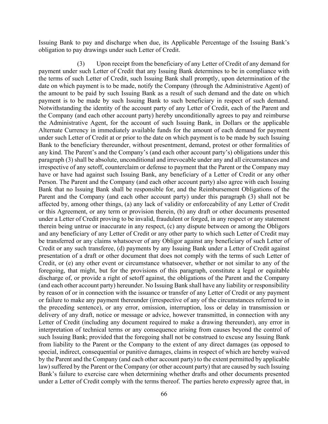 66开证行付款和到期解除,其适用百分比开证行在该信用证项下支付提款的义务。(3)任何信用证的受益人收到任何开证银行认定符合该信用证条款的根据该信用证提出的任何付款要求后,该开证银行应在确定付款日期后迅速,通知公司(通过行政代理人)该开证行因该要求而须支付的金额,以及该开证行就该要求向该受益人支付款项的日期。尽管有任何信用证的账户方的身份,母公司和公司(以及彼此的账户方)在此无条件同意为该开证银行的账户,在该开证银行将根据该信用证向受益人付款之日或之前,以美元或适用的替代货币以即时可用的资金支付和偿还该行政代理人根据该信用证提出的每项付款要求的金额,而无需出示、要求、抗议或其他任何形式的手续。母公司和公司(以及彼此的账户方)在本第(3)款下的义务在任何和所有情况下均应是绝对、无条件和不可撤销的,无论母公司或公司可能对开证银行、信用证的任何受益人或任何其他人拥有或已经拥有的任何抵销、反诉或抗辩付款。母公司和公司(以及彼此的账户方)还与各开证银行约定,任何开证银行均不负责,母公司和公司(以及彼此的账户方)在本第(3)款下的偿付义务不受(其中包括)(a)任何信用证或本协议或其中任何条款或规定缺乏有效性或可执行性的影响,(b)根据信用证出示的任何汇票或其他单证证明为无效、欺诈或伪造的,在任何方面或其中的任何陈述在任何方面不真实或不准确,(c)义务人与任何信用证的任何受益人或该信用证可转让给的任何其他方之间或之间的任何争议,或任何义务人针对该信用证的任何受益人或任何该等受让人提出的任何债权,(d)任何开证银行在出示不符合该信用证条款的汇票或其他单证的情况下根据信用证支付的款项,或(e)任何其他事件或情况,不论是否与上述任何情况相似,但如无本款规定,可能构成对母公司和公司(以及彼此的账户方)在本协议项下的义务的合法或衡平法履行或提供抵销权。任何开证行均不得因任何信用证的签发或转让或任何根据该信用证支付或未支付任何款项(不论前句所指的任何情况),或任何汇票、通知或电文或意见的传送或交付(不论已传送)中的任何错误、遗漏、中断、遗失或延迟,而与任何信用证(包括根据该信用证作出提款所需的任何单证)有关,而承担任何法律责任或责任,技术术语解释上的任何错误或由该开证行无法控制的原因引起的任何后果;但上述情况不应被解释为免除任何开证行在任何直接损害(而不是特殊、间接、后果性或惩罚性损害)的范围内对母公司或公司承担的责任,母公司或公司(或其他账户方)因开证银行在确定信用证项下出示的汇票和其他单证是否符合其条款时未谨慎行事而遭受的母公司和公司(以及彼此的账户方)特此放弃的索赔。双方明确同意,在