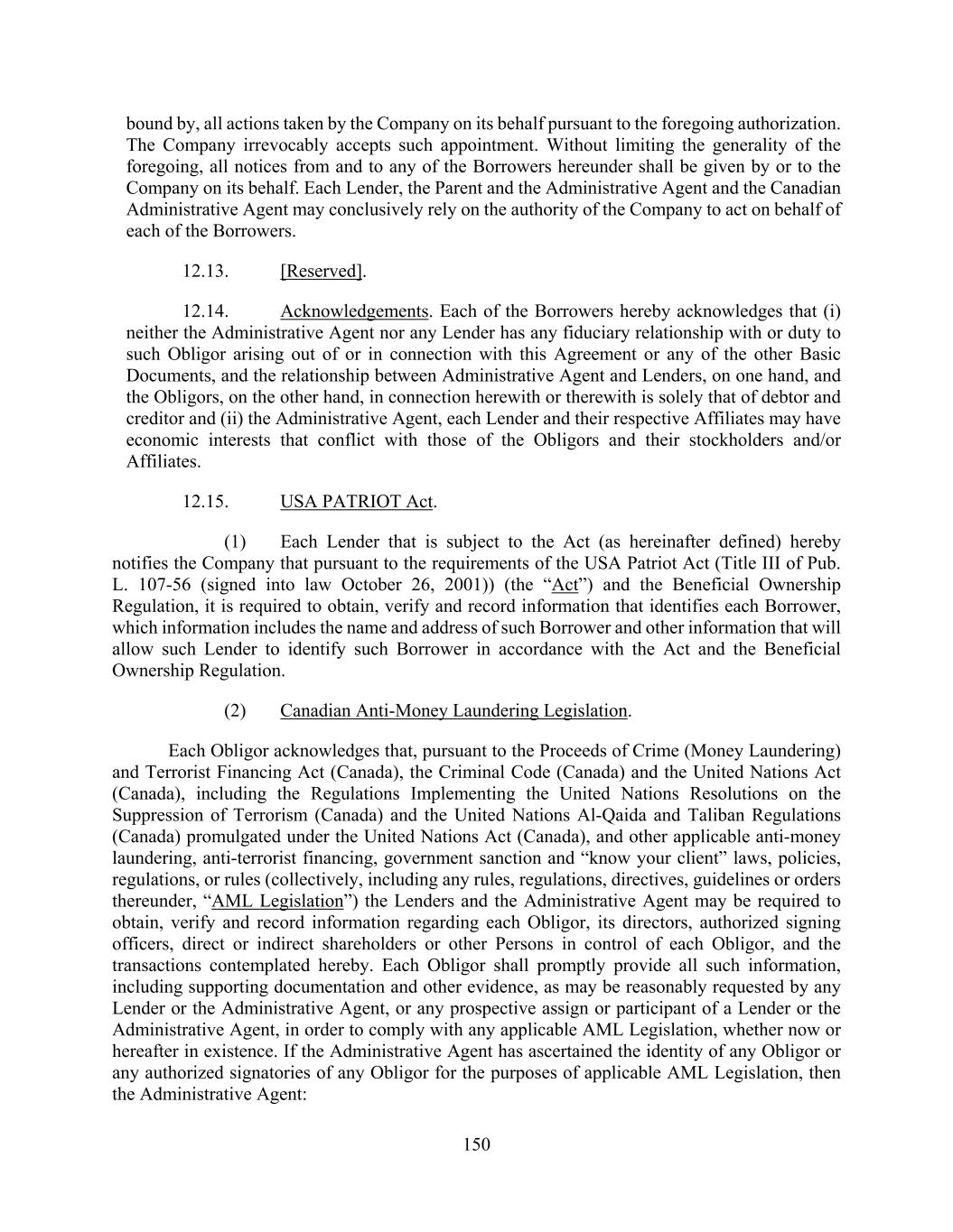 150 bound by,本公司根据上述授权代表其采取的所有行动。公司不可撤销地接受该任命。在不限制前述一般性的情况下,本协议项下任何借款人发出的所有通知均应由公司或代表公司向其发出。每个贷款人、母公司和行政代理人以及加拿大行政代理人可以最终依赖公司的授权来代表每个借款人行事。12.13.[保留]。12.14.致谢。各借款人在此确认,(i)行政代理人或任何贷款人均不与该等债务人产生或与本协议或任何其他基本文件有关的任何信托关系或对该等债务人承担任何责任,而行政代理人和贷款人之间的关系,而另一方面与本协议或与本协议或与本协议有关的有关的债务人和债权人之间的关系仅为债务人和债权人的关系,以及(ii)行政代理人、各贷款人及其各自的关联机构可能拥有与该等债务人及其股东和/或关联机构的经济利益相冲突的经济利益。12.15.美国爱国者法案。(1)受该法案(以下定义)约束的每个贷款人特此通知公司,根据《美国爱国者法案》(Pub的Title III。L. 107-56(2001年10月26日签署成为法律))(“法案”)和《受益所有权条例》,要求获得、核实和记录识别每个借款人的信息,这些信息包括该借款人的名称和地址以及允许该贷款人根据该法案和《受益所有权条例》识别该借款人的其他信息。(2)加拿大反洗钱立法。各义务人承认,根据《犯罪所得(洗钱)和恐怖主义融资法案》(加拿大)、《刑法》(加拿大)和《联合国法》(加拿大),包括《执行联合国制止恐怖主义决议条例》(加拿大)和《联合国法》(加拿大)颁布的《联合国基地组织和塔利班条例》(加拿大),以及其他适用的反洗钱、反恐怖主义融资、政府制裁和“了解你的客户”法律、政策、条例或规则(统称,包括任何规则、条例、指令、指导方针或命令,“反洗钱立法”),贷款人和行政代理人可能需要获得,核实并记录有关每名债务人、其董事、授权签署人员、直接或间接股东或控制每名债务人的其他人的信息,以及在此拟进行的交易。各债务人应迅速提供任何贷款人或行政代理人、或贷款人或行政代理人的任何潜在受让人或参与者可能合理要求的所有此类信息,包括证明文件和其他证据,以遵守任何适用的反洗钱立法,无论是现在还是以后都存在。如果行政代理人已为适用的反洗钱立法的目的确定任何债务人或任何债务人的任何授权签字人的身份,则行政代理人:
