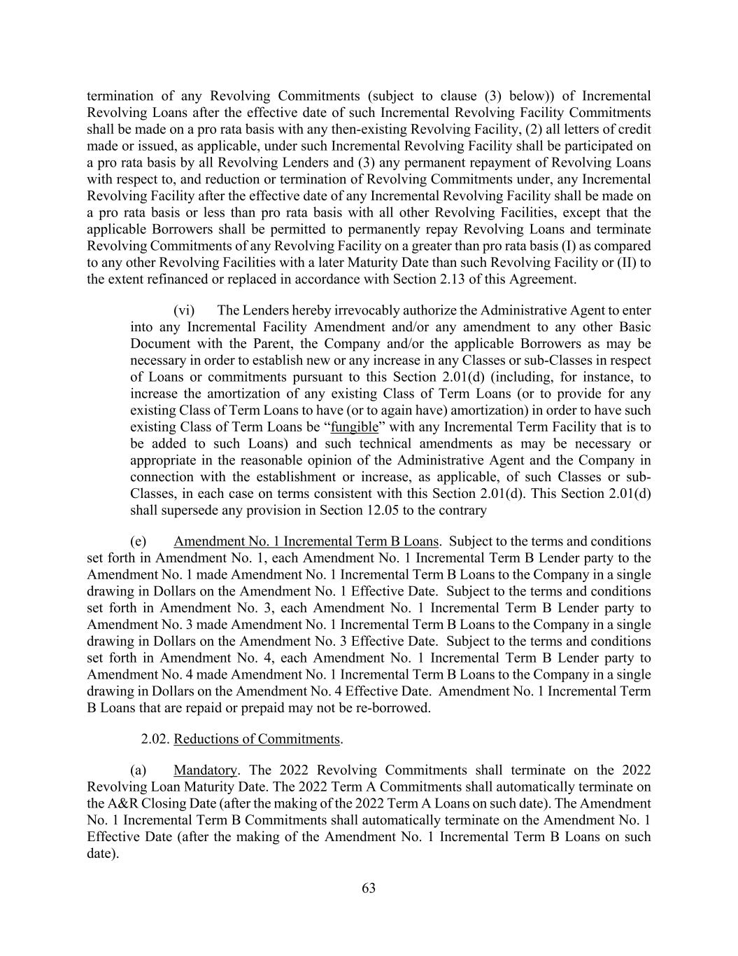 63在此种增量循环贷款承诺生效日期后终止任何循环承诺(受下文第(3)款的限制),应按比例使用当时存在的任何循环贷款,(2)所有循环贷款人应按比例参与在此种增量循环贷款下作出或签发的所有信用证(如适用),以及(3)循环贷款的任何永久偿还,以及根据以下规定减少或终止循环承诺,任何增量循环贷款生效日期后的任何增量循环贷款应与所有其他循环贷款按比例或低于比例提供,但应允许适用的借款人永久偿还循环贷款并终止任何循环贷款的循环承诺,其比例高于到期日晚于该循环贷款的任何其他循环贷款,或(II)根据本协议第2.13节再融资或替换的范围。(vi)贷款人在此不可撤销地授权行政代理人与母公司、公司和/或适用的借款人订立任何增量融资修订和/或任何其他基本文件的修订(视需要而定),以便根据本条2.01(d)就贷款或承诺确立新的或任何类别或子类的增加(包括,例如,增加任何现有类别定期贷款的摊销(或规定任何现有类别定期贷款有(或再次有)摊销),以便使该等现有类别定期贷款与将添加到该等贷款中的任何增量定期融资“可替代”)以及行政代理人和公司合理认为可能必要或适当的与设立或增加(如适用)该等类别或次级类别有关的技术性修订,在每种情况下的条款与本条2.01(d)一致。本条第2.01(d)条须取代第12.05条中与(e)修订第1号增量定期B贷款相反的任何条文。在符合第1号修正案规定的条款和条件下,第1号修正案的每一项修正案第1号增量期限B贷款方在第1号修正案生效日期以美元单次提款的方式向公司作出第1号增量期限B贷款。在符合第3号修订规定的条款及条件下,第3号修订的每项修订第1号增量期限B贷款方于第3号修订生效日期以美元单次提款方式向公司作出修订第1号增量期限B贷款。在符合第4号修正案规定的条款和条件的情况下,第4号修正案的每一项修正案第1号增量期限B贷款方在第4号修正案生效日期以美元单次提款方式向公司作出第1号增量期限B贷款。修正1号增量B期贷款已偿还或提前偿还的,不得再借。2.02.减少承付款。(a)强制性。2022年循环承诺于2022年循环贷款到期日终止。2022年A期承诺应在A & R截止日(在该日期发放2022年A期贷款后)自动终止。修正1号增量期B承诺自修正1号生效之日起自动终止(自修正1号增量期B贷款在该日期作出后)。
