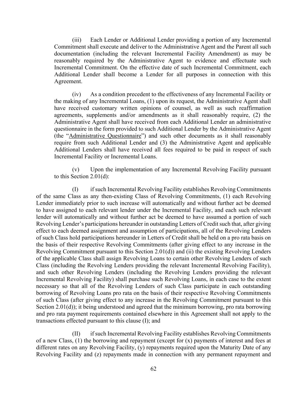 62(iii)提供任何增量承诺的一部分的每个贷款人或额外贷款人应执行并向行政代理人和母公司交付行政代理人可能合理要求的所有文件(包括相关的增量融资修订),以证明和实现该增量承诺。在此种增量承诺生效之日,每一额外的贷款人应成为与本协议有关的所有目的的贷款人。(四)作为任何增量融资的有效性或提供任何增量贷款的先决条件,(1)经其请求,行政代理人应已收到律师的惯常书面意见,以及其合理要求的重申协议、补充和/或修订,(2)行政代理人应已从每一额外贷款人收到行政代理人按其向该额外贷款人提供的格式提供的行政调查表(“行政调查表”)及其合理要求的其他文件,以及(3)行政代理人和适用的额外贷款人应已收到就该等增量融资或增量贷款须支付的所有费用。(五)在根据本条第2.01(d)款实施任何增量循环贷款时:(i)如果此种增量循环贷款确立了与当时存在的任何一类循环承付款项相同类别的循环承付款项,(1)紧接此种增加之前的每一循环贷款人将自动且无进一步行动地被视为已根据增量贷款机制转让给每一相关贷款人,而每一此种相关贷款人将自动且无进一步行动地被视为已承担该循环贷款人根据本协议参与未偿信用证的一部分,从而,在每项被视为转让和假设参与生效后,该类别的所有循环放款人根据其各自的循环承诺(在根据本条2.01(d)增加循环承诺生效后)按比例持有信用证项下的参与,以及(ii)适用类别的现有循环放款人应将循环贷款转让给该类别的某些其他循环放款人(包括提供相关增量循环融资的循环放款人),及该等其他循环放款人(包括提供相关增量循环贷款的循环放款人)应在每种情况下以必要程度购买该等循环贷款,以便该类别的所有循环放款人根据其各自的该类别循环承诺(在根据本节2.01(d)实施循环承诺的任何增加后)按比例参与每笔未偿还的循环贷款借款;经理解并同意,最低借款,本协议其他部分所载的按比例借款和按比例付款要求不适用于根据本条款(I)进行的交易;(II)如果此类增量循环融资确立了新类别的循环承诺,(1)借款和还款(除(x)以任何循环融资的不同利率支付利息和费用外,(y)任何循环融资到期日所要求的还款,以及(z)与任何永久还款有关的还款和