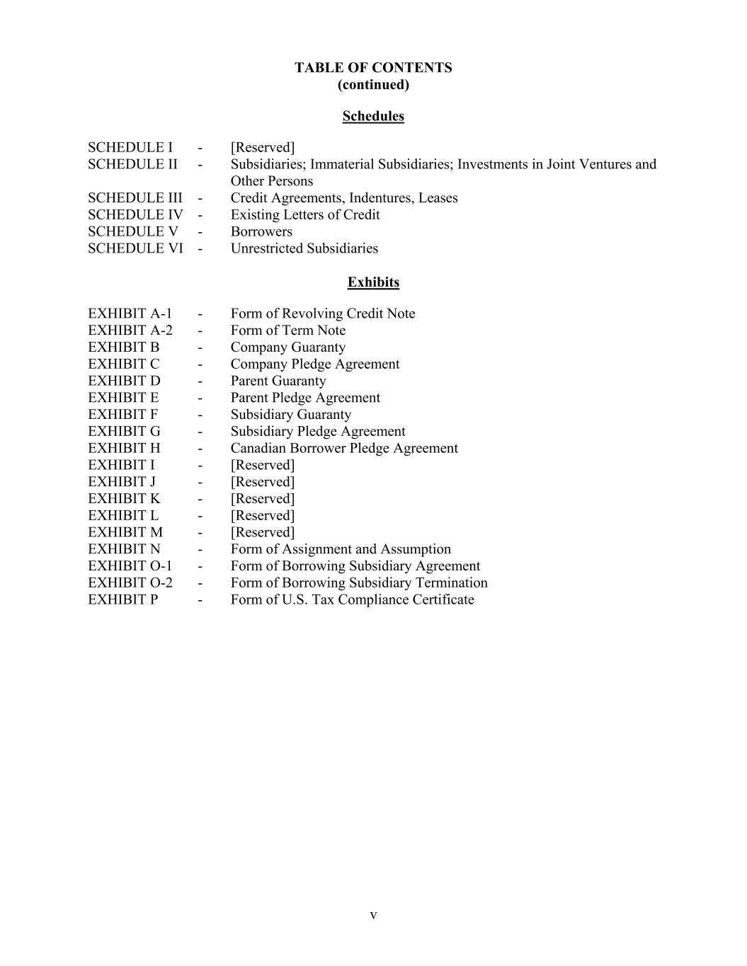 目录(续)v附表附表I-[保留]附表II-子公司;非物质子公司;对合资企业和其他人的投资附表III-信贷协议、契约,租赁附表四-现有信用证附表五-借款人附表六-非受限制子公司展品A-1-循环信用票据表格A-2-定期票据表格展品B-公司担保展品C-公司质押协议展品D-母公司担保展品E-母公司质押协议展品F-子公司担保展品G-子公司质押协议展品H-加拿大借款人质押协议展品I-[保留]展品J-[保留]展品K-[保留]展品L-[保留]展品M-[保留]假设EXHIBIT O-1-借款子公司协议表格EXHIBIT O-2-借款子公司终止协议表格EXHIBIT P-美国税务合规证书表格