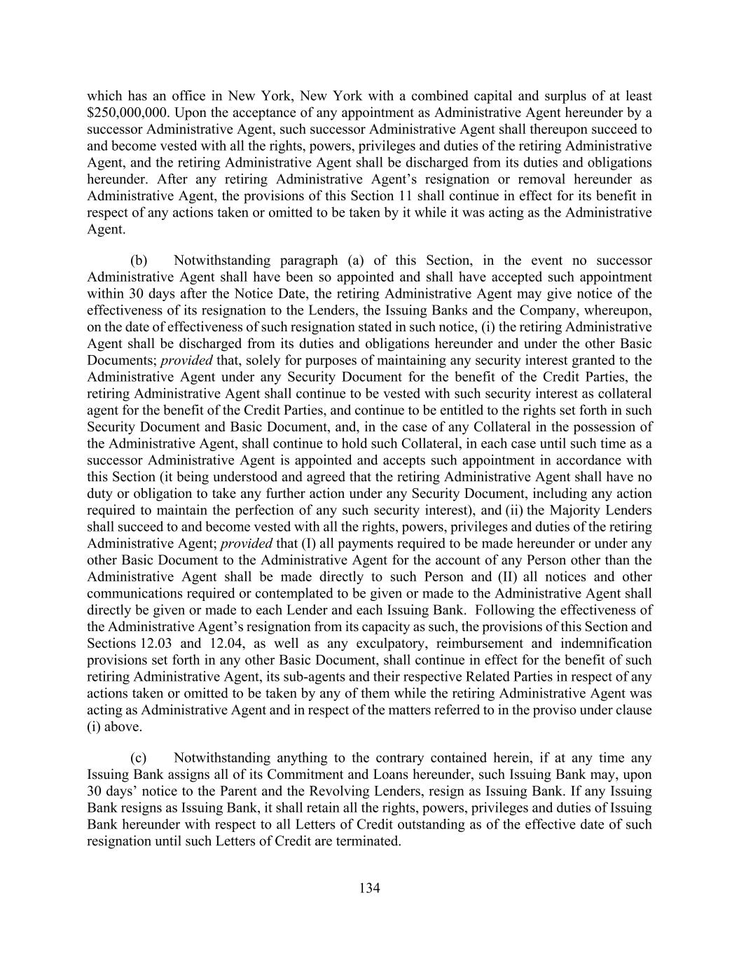 134其在纽约州纽约设有办事处,总资本和盈余至少为250,000,000美元。继任行政代理人接受本协议项下行政代理人的任何委任后,该继任行政代理人应随之继承并被赋予退任行政代理人的一切权利、权力、特权和义务,退任行政代理人应解除其在本协议项下的职责和义务。退任行政代理人辞去或解除本协议所规定的行政代理人职务后,其在担任行政代理人期间采取或不采取的任何行动,为其利益,本条第11款的规定继续有效。(b)尽管有本条(a)款的规定,如无继任行政代理人获如此委任,并须在该通知日期后30天内接受该委任,则退任行政代理人可向贷款人、开证银行及公司发出其辞职生效通知,据此,在该通知所述的该辞职生效日期,(i)退任行政代理人须解除其在本协议项下及其他基本文件项下的职责及义务;但,仅为维护根据任何担保文件授予行政代理人的任何担保权益,以利于信贷当事人,退任行政代理人应继续作为担保代理人为信贷当事人的利益而被授予该担保权益,并继续有权享有该担保文件和基本文件中规定的权利,如该行政代理人管有任何担保物,则应继续持有该担保物,在每一种情况下,直至继任行政代理人根据本条获委任并接受该等委任为止(经理解及同意,退休行政代理人没有责任或义务根据任何担保文件采取任何进一步行动,包括为维持任何该等担保权益的完善而需要采取的任何行动),及(ii)多数贷款人应继承并被赋予所有权利、权力,退任行政代理人的特权和职责;但(i)根据本协议或根据任何其他基本文件为行政代理人以外的任何人的账户向行政代理人支付的所有款项应直接支付给该人,以及(ii)要求或预期向行政代理人发出或作出的所有通知和其他通信应直接向各贷款人和各开证银行发出或作出。在行政代理人辞去其本身的身份生效后,本节和第12.03和12.04节的规定,以及任何其他基本文件中规定的任何开脱、补偿和赔偿规定,应为该退休行政代理人、其子代理人及其各自的关联方的利益而继续有效,就他们中的任何一方在退休行政代理人担任行政代理人期间采取或不采取的任何行动,以及就上文第(i)款但书所述事项而言。(c)即使本条例另有相反规定,如任何开证行在任何时间转让其根据本条例所作的所有承诺及贷款,该开证行可在向母公司及循环贷款人发出30天通知后,辞去开证行的职务。任何开证行如辞去开证行的职务,应保留开证行在本协议项下就截至该辞职生效之日尚未结清的所有信用证享有的所有权利、权力、特权和义务,直至该等信用证终止为止。