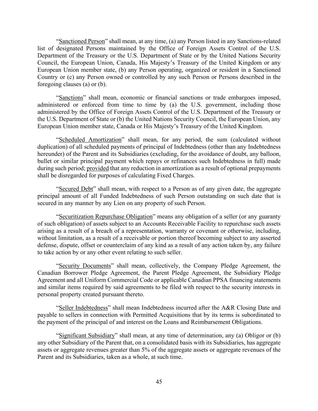 45“受制裁人员”是指,在任何时候,(a)美国财政部或美国国务院外国资产控制办公室或联合国安全理事会、欧盟、加拿大、英国国王陛下财政部或任何欧盟成员国维持的任何与制裁有关的指定人员名单中所列的任何人,(b)在被制裁国家经营、组织或居住的任何人,或(c)由上述(a)或(b)条所述任何此类人员或人员拥有或控制的任何人。“制裁”是指(a)美国政府不时实施、管理或执行的经济或金融制裁或贸易禁运,包括由美国财政部或美国国务院外国资产控制办公室或(b)联合国安全理事会、欧盟、任何欧盟成员国、加拿大或英国财政部管理的制裁或贸易禁运。“预定摊销”是指,在任何期间,母公司及其子公司的债务本金(本协议项下的任何债务除外)的所有预定付款(为免生疑问,不包括全额偿还或再融资该债务的任何气球、子弹或类似本金付款)的总和(计算时不重复);但为计算固定费用的目的,应忽略因可选的预付款而导致的任何摊销减少。“有担保债务”就某人而言,是指该人在该日期未偿还的所有已融资债务的本金总额,该债务以任何方式由对该人任何财产的任何留置权作担保。“证券化回购义务”是指受应收账款融资约束的资产的卖方(或此类义务的任何担保)因违反陈述、保证或契约或其他方式而产生的回购此类资产的任何义务,包括但不限于由于应收款或其部分因其采取的任何行动、未采取行动或与该卖方有关的任何其他事件而成为任何声称的抗辩、争议、抵消或任何种类的反索赔的结果。“担保文件”统称为公司质押协议、加拿大借款人质押协议、母公司质押协议、附属质押协议和所有统一商法典或适用的加拿大PPSA融资报表以及上述协议要求就据此设定的个人财产上的担保权益进行备案的类似项目。“卖方债务”系指在A & R结束日期之后发生的、就许可收购应付给卖方的债务,而根据其条款,这些债务从属于贷款和偿还义务的本金和利息的支付。“重要子公司”是指,在任何确定时间,任何(a)义务人或(b)母公司的任何其他子公司,在与其子公司合并的基础上,合计资产或合计收入超过母公司及其子公司合计资产或合计收入的5%,作为一个整体,在该时间。