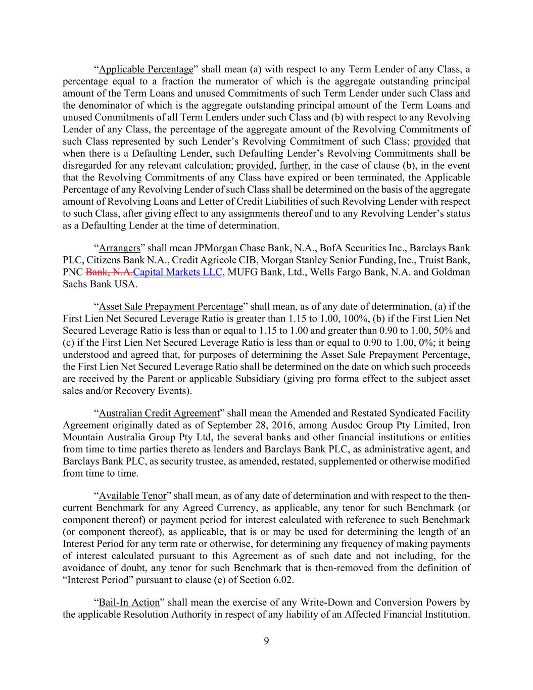9“适用百分比”系指(a)就任何类别的任何定期贷款人而言,一个百分比等于一个分数,其分子为该定期贷款人在该类别下的定期贷款和未使用承诺的未偿还本金总额,其分母为该类别下所有定期贷款人的定期贷款和未使用承诺的未偿还本金总额,以及(b)就任何类别的任何循环贷款人而言,该贷款人的该类别的循环承诺所代表的该类别的循环承诺总额的百分比;条件是,当存在违约贷款人时,该违约贷款人的循环承诺应在任何相关计算中不予考虑;此外,在(b)条的情况下,如果任何类别的循环承诺已到期或已终止,此类类别的任何循环贷款人的适用百分比应根据此类循环贷款人就此类类别的循环贷款和信用证负债总额确定,在其任何转让生效后,以及在确定时任何循环贷款人作为违约贷款人的地位。“安排者”是指摩根大通银行,N.A.、美国银行证券公司、巴克莱银行 PLC、Citizens Bank N.A.、Credit Agricole CIB、摩根士丹利 Senior Funding,Inc.、Truist Bank、PNC Bank、N.A.Capital Markets LLC、MUFG Bank,Ltd.、富国银行 Bank,N.A.和高盛 Sachs Bank USA。“资产出售提前还款百分比”是指,截至任何确定日期,(a)如果第一留置权净担保杠杆率大于1.15至1.00,则为100%,(b)如果第一留置权净担保杠杆率小于或等于1.15至1.00,大于0.90至1.00,则为50%;(c)如果第一留置权净担保杠杆率小于或等于0.90至1.00,为0%;经了解并同意,为确定资产出售提前还款百分比,第一留置权净担保杠杆比率应在母公司或适用的子公司收到该等收益之日确定(给予标的资产出售和/或追偿事件的备考效力)。“澳大利亚信贷协议”系指Ausdoc Group Pty Limited、铁山 Australia Group Pty Ltd、数家银行和其他金融机构或实体作为贷款人以及作为行政代理人的巴克莱银行 PLC和作为证券受托人的巴克莱银行 PLC之间最初日期为2016年9月28日的经修订和重述的银团融资协议,该协议经不时修订、重述、补充或以其他方式修改。“可用期限”是指,截至任何确定日期,就任何商定货币当时的基准(如适用)而言,该基准(或其组成部分)的任何期限或参照该基准(或其组成部分)计算的利息支付期(如适用),目前或可能用于确定任何期限利率或其他方面的利息期长度,用于确定截至该日期根据本协议计算的利息支付的任何频率,为免生疑问,不包括,然后根据第6.02条(e)款从“利息期”定义中删除的此类基准的任何期限。“纾困行动”是指适用的处置当局就受影响金融机构的任何负债行使任何减记和转换权力。