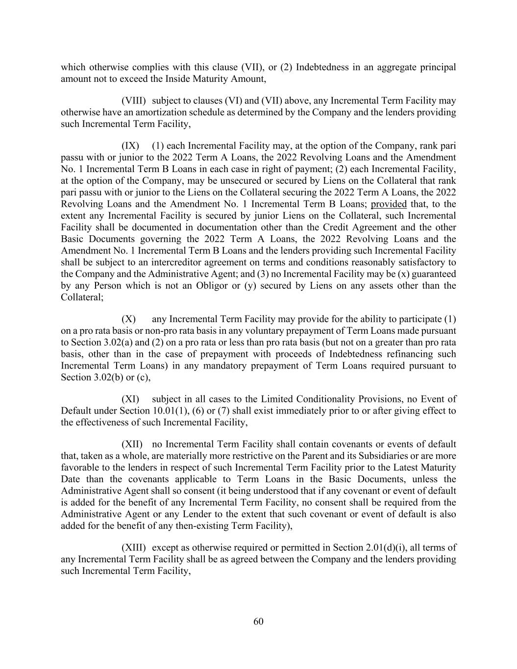 60以其他方式符合本条款(VII),或(2)本金总额不超过内部到期金额的债务,(VIII)在符合上述第(VI)和(VII)条的情况下,任何增量定期融资可能会有公司和提供此类增量定期融资的贷方确定的摊销时间表,(IX)(1)每项增量融资可根据公司的选择,与2022年A期贷款享有同等地位或低于该期限,2022年度循环贷款及每宗个案中的第1号修订版增量B期贷款的受偿权;(2)每项增量融资可由公司选择以抵押品上的留置权作无抵押或担保,该留置权与担保2022年A期贷款、2022年循环贷款和第1号修订版增量B期贷款的抵押品上的留置权具有同等地位或低于其优先权;但在任何增量融资由抵押品上的次级留置权作担保的范围内,该等增量融资应在信贷协议和适用于2022年A期贷款的其他基本文件以外的文件中记录,2022年循环贷款及修订第1号增量B期贷款及提供该等增量融资的贷款人须根据公司及行政代理人合理满意的条款及条件订立债权人间协议;(3)任何增量融资不得由任何非债务人的人(x)担保,或(y)以抵押品以外的任何资产的留置权作担保;(x)任何增量定期融资可规定有能力按比例或非按比例参与(1)根据第3.02(a)和(2)节按比例或低于比例(但不得高于按比例)提供的任何自愿提前偿还定期贷款,除以债务收益再融资此类增量定期贷款提前还款的情况外)在根据第3.02(b)或(c)条要求的任何强制性提前偿还定期贷款中,(XI)在所有情况下均须遵守有限条件条款,在紧接此类增量融资生效之前或之后不得存在根据第10.01(1)、(6)或(7)条发生的违约事件,(XII)任何增量定期融资不得包含作为一个整体的契诺或违约事件,与基本文件中适用于定期贷款的契诺相比,在最晚到期日之前就该等增量定期融资对母公司及其子公司具有实质性更强的限制性或对贷款人更有利,除非行政代理人如此同意(据了解,如果为了任何增量定期融资的利益而添加任何契诺或违约事件,如该等契诺或违约事件亦为任何当时存在的定期融资的利益而增加,则无须征得行政代理人或任何贷款人的同意),(XIII)除非第2.01(d)(i)条另有规定或许可,任何增量定期融资的所有条款均须按公司与提供该等增量定期融资的贷款人之间的协议,