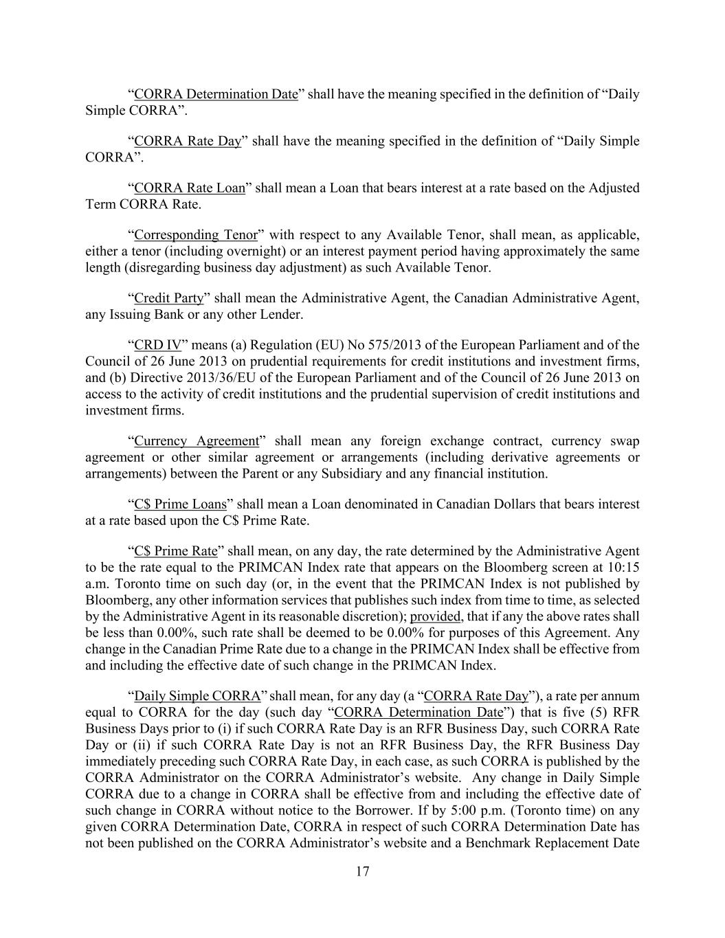 17“CORRA确定日期”应具有“日常简单CORRA”定义中规定的含义。“CORRA Rate Day”应具有“Daily Simple CORRA”定义中规定的含义。“CORRA利率贷款”是指按调整后期限CORRA利率计息的贷款。就任何可用期限而言,“相应期限”(corresponding tenor)应在适用时指期限(包括隔夜)或与该可用期限长度大致相同(不考虑营业日调整)的利息支付期。“信用方”是指行政代理人、加拿大行政代理人、任何发行银行或任何其他贷款人。“CRD IV”是指(a)欧洲议会和理事会2013年6月26日关于信贷机构和投资公司审慎要求的(EU)第575/2013号条例,以及(b)欧洲议会和理事会2013年6月26日关于信贷机构活动准入和信贷机构和投资公司审慎监管的第2013/36/EU号指令。“货币协议”是指母公司或任何子公司与任何金融机构之间的任何外汇合约、货币互换协议或其他类似协议或安排(包括衍生协议或安排)。“加元优惠贷款”是指以加元计价、按加元优惠利率计息的贷款。“加元最优惠利率”是指,在任何一天,由行政代理人确定为等于该天多伦多时间上午10:15出现在彭博屏幕上的PRIMCAN指数利率的利率(或者,在彭博未发布PRIMCAN指数的情况下,由行政代理人在其合理酌情权下选择的任何其他不时发布该指数的信息服务);但如有任何上述利率低于0.00个百分点,则就本协议而言,该利率应被视为0.00个百分点。加拿大最优惠利率因PRIMCAN指数变动而发生的任何变动,自并包括PRIMCAN指数的该变动生效之日起生效。“每日简单CORRA”是指,就任何一天(“CORRA利率日”)而言,在(i)如果该CORRA利率日是RFR营业日,则该CORRA利率日或(ii)如果该CORRA利率日不是RFR营业日,则该CORRA紧接在该CORRA利率日之前的RFR营业日(在每种情况下,因为该CORRA由CORRA管理员在CORRA管理员的网站上发布。因CORRA变更而导致的Daily Simple CORRA的任何变更应自CORRA的此类变更生效之日(包括该变更生效之日)起生效,恕不通知借款人。如果在任何特定的CORRA确定日期的下午5:00(多伦多时间)之前,有关此类CORRA确定日期的CORRA尚未在CORRA管理员的网站和基准替换日期上发布