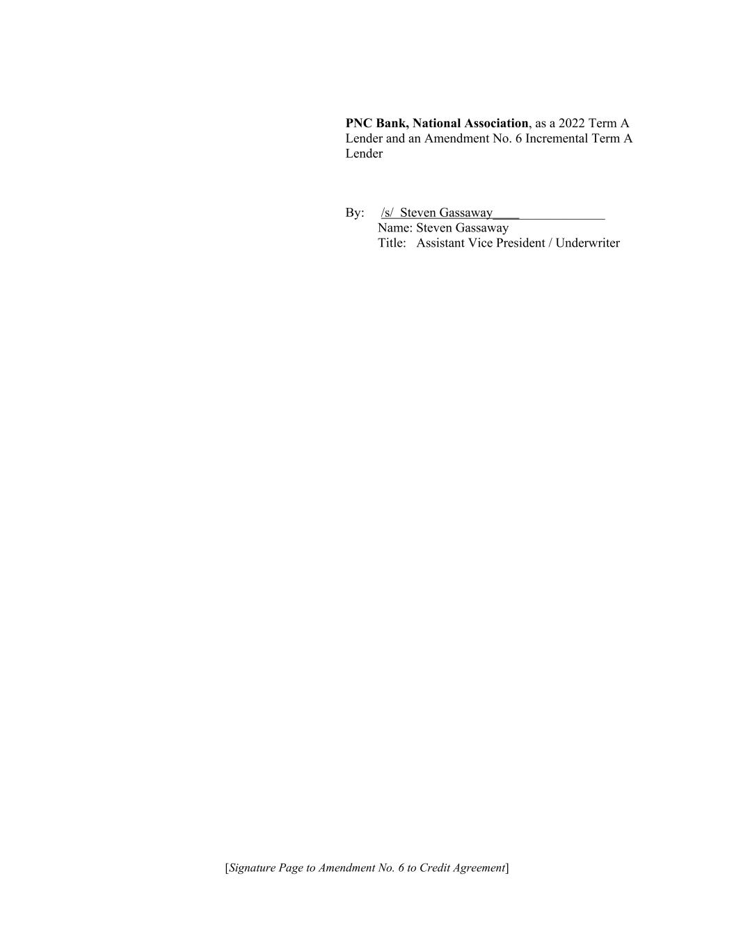 【信贷协议第6号修正案签署页】PNC银行,全国协会,作为2022年期限A贷款人和第6号修正案增量期限A贷款人:/s/Steven Gassaway ________________姓名:Steven Gassaway职务:助理副总裁/承销商