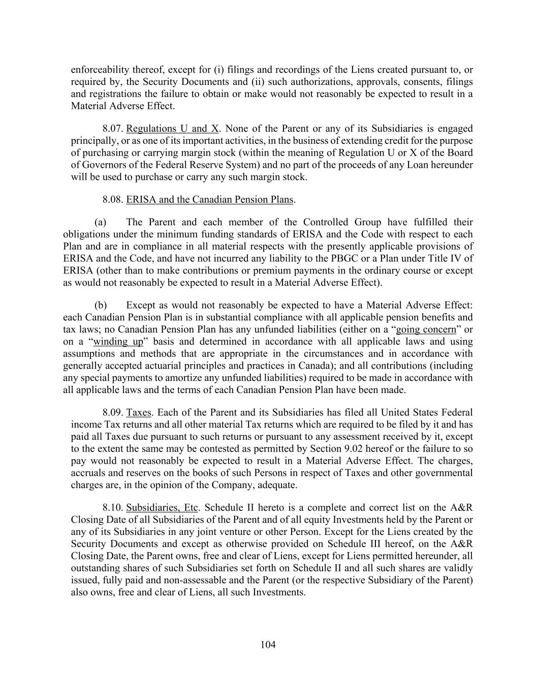 104其可执行性,但(i)根据担保文件或由担保文件要求建立的留置权的备案和记录以及(ii)此类授权、批准、同意、备案和登记除外,未能获得或作出的不会合理地预期会导致重大不利影响。8.07.条例U和X.母公司或其任何子公司均未主要从事或作为其重要活动之一从事为购买或持有保证金股票(在联邦储备系统理事会条例U或X的含义内)而提供信贷的业务,并且本协议项下任何贷款的收益的任何部分将不用于购买或持有任何此类保证金股票。8.08.ERISA和加拿大养老金计划。(a)母公司和受控集团的每个成员已就每个计划履行了ERISA最低筹资标准和守则规定的义务,并在所有重大方面遵守了ERISA和守则目前适用的规定,并且没有对PBGC或ERISA标题IV下的计划承担任何责任(除了在正常过程中作出供款或保费支付或合理预期不会导致重大不利影响的情况除外)。(b)除非合理地预计不会产生重大不利影响:每个加拿大养老金计划基本上符合所有适用的养老金福利和税法;没有任何加拿大养老金计划有任何无资金准备的负债(在“持续经营”或“清盘”基础上,并根据所有适用法律并使用假设和方法确定根据情况和加拿大普遍接受的精算原则和做法适当的);以及根据所有适用法律和每个加拿大养老金计划的条款要求支付的所有缴款(包括摊销任何无资金准备的负债的任何特别付款)均已支付。8.09.税。母公司及其子公司均已提交其要求提交的所有美国联邦所得税申报表和所有其他重要纳税申报表,并已根据此类申报表或根据其收到的任何评估支付了所有应缴税款,除非在本协议第9.02条允许的情况下可能有争议,或者未能如此支付不会合理地预期会导致重大不利影响。该公司认为,该等人士账上有关税务及其他政府收费的收费、应计及储备金是足够的。8.10.子公司等。附表二是母公司所有子公司的A & R截止日期以及母公司或其任何子公司在任何合资企业或其他人中持有的所有股权投资的完整和正确的清单。除担保文件设定的留置权外,除本协议附表III另有规定外,在A & R截止日,母公司拥有、自由和没有留置权,但本协议允许的留置权除外,附表II所列该等附属公司的所有已发行股份和所有该等股份均有效发行、已缴足且不可评估,且母公司(或母公司各自的子公司)还拥有、自由和没有留置权的所有该等投资。