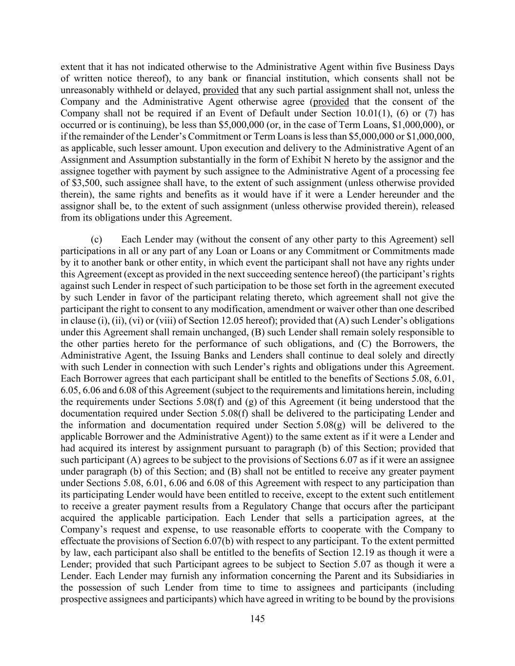 145在其未在书面通知的五个营业日内向行政代理人另有说明的范围内),向任何银行或金融机构作出同意,不得无理拒绝或延迟,但任何该等部分转让,除非公司与行政代理人另有约定(但如根据第10.01(1)、(6)或(7)条已发生或正在继续发生违约事件,则无须公司同意),不得少于5,000,000美元(如属定期贷款,则为1,000,000美元),或者如果贷款人的承诺或定期贷款的剩余部分少于5,000,000美元或1,000,000美元(如适用),则为较少金额。转让人和受让人在执行并向行政代理人交付实质上以本协议的附件 N形式的转让和承担时,连同该受让人向行政代理人支付3,500美元的处理费,该受让人应在该转让的范围内(除非其中另有规定)拥有与其在本协议下作为贷款人时所拥有的相同的权利和利益,而转让人应在该转让的范围内(除非其中另有规定)免除其在本协议下的义务。(c)每一贷款人可(未经本协议任何其他方同意)出售其向另一家银行或其他实体作出的任何贷款或贷款或任何承诺的全部或任何部分的参与权,在这种情况下,参与人不得享有本协议项下的任何权利(本协议下一句中的规定除外)(参与人就该参与针对该贷款人的权利为该出借人签署的有利于该参与人的协议中所述的权利,除本协议第12.05条第(i)、(ii)、(vi)或(viii)款所述的修改、修改或放弃外,该协议不得赋予参与人同意任何修改、修改或放弃的权利;但前提条件是(a)该贷款人在本协议下的义务保持不变,(b)该贷款人仍应对该义务的履行承担全部责任,以及(c)借款人、行政代理人、发行银行和贷款人应继续就该贷款人在本协议下的权利和义务单独直接与该贷款人打交道。每一借款人同意,每一参与人均有权享受本协议第5.08、6.01、6.05、6.06和6.08条规定的利益(但以本协议的要求和限制为限,包括本协议第5.08(f)和(g)节规定的要求(但有一项理解,即第5.08(f)节规定的文件应交付给参与贷款人,第5.08(g)节规定的信息和文件将交付给适用的借款人和行政代理人)),其程度与其是贷款人并根据本节(b)款通过转让获得其权益的程度相同;但该参与人(a)同意受第6.07节规定的约束为如果它是本条(b)款规定的受让人;(b)根据本协议第5.08、6.01、6.06和6.08条,就任何参与而言,无权获得比其参与贷款人本应有权获得的更多的付款,除非这种获得更多付款的权利是由于参与者获得适用参与后发生的监管变化。出售参与的每个贷款人同意,在公司的要求和费用下,通过合理的努力与公司合作,以实现第6.07(b)节关于任何参与者的规定。在法律允许的范围内,每个参与者也应有权享有第12.19条的利益,如同其是贷款人一样;但前提是该参与者同意受第5.07条的约束,如同其是贷款人一样。各出借人可不时向书面同意受条文约束的受让人和参与人(包括预期受让人和参与人)提供有关该出借人所管有的母公司及其子公司的任何信息