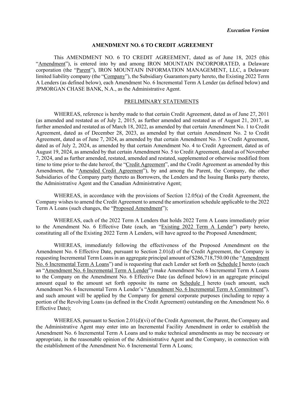 执行版本修订第6号至信贷协议本修订第6号至信贷协议,日期为2025年6月18日(本“修订”),由特拉华州公司IRON MONTAIN INCORPORATed(“母公司”)、特拉华州有限责任公司IRON MONTAIN INFORMATION MAGEMENT,LLC(“公司”)、本协议的附属担保方、现有的2022年期限A放款人(定义见下文)、每项修订第6号增量期限A放款人(定义见下文)和JPMorgan CHASE BANK,N.A.作为行政代理人订立。然而,谨此提述截至2011年6月27日的若干信贷协议(截至2015年7月2日经修订和重述,截至2017年8月21日经进一步修订和重述,截至2022年3月18日经进一步修订和重述,截至2023年12月28日经信贷协议第1号修订,截至2024年6月7日经信贷协议第2号修订,截至2024年7月2日经信贷协议第3号修订,经日期为2024年8月19日的信贷协议第4号若干修订修订修订,经日期为2024年11月7日的信贷协议第5号若干修订修订修订,以及经进一步修订、重述、修订及重述、补充或以其他方式于本协议日期前不时修订的《信贷协议》及经本修订修订的信贷协议,“经修订的信贷协议”),由母公司、公司、作为借款方的公司其他附属公司、贷款人及作为借款方的发行银行之间,行政代理人及加拿大行政代理人;鉴于根据信贷协议第12.05(a)节的规定,公司希望修订信贷协议,以修订适用于2022年A期贷款的摊销时间表(该等变更,“建议修订”);鉴于在紧接第6号修订生效日期之前持有2022年A期贷款的每一2022年A期贷款人(各自为“现有2022年A期贷款人”),构成所有现有2022年A期贷款人,将已同意建议修订;鉴于,紧随建议修订于第6号修订生效日期生效后,根据信贷协议第2.01(d)节,公司要求提供本金总额为286,718,750.00美元的增量定期贷款(“第6号修正案增量期限A贷款”),并要求在本协议附表I中列出的每个贷款人(每个都是“第6号修正案增量期限A贷款人”)在第6号修正案生效日期(定义见下文)向公司提供本金总额等于本协议附表I中与其名称相对的金额(该金额,该第6号修正案增量期限A贷款人的“第6号修正案增量期限A承诺”),而该等金额将由公司申请用于一般公司用途(包括偿还于第6号修订生效日期尚未偿还的部分循环贷款(定义见信贷协议));鉴于根据信贷协议第2.01(d)(vi)节,母公司、公司及行政代理人可订立增量融资修订,以确立第6号修订的增量A期贷款,并根据行政代理人及公司的合理意见作出必要或适当的技术性修订,与设立第6号修正案增量A期贷款有关;