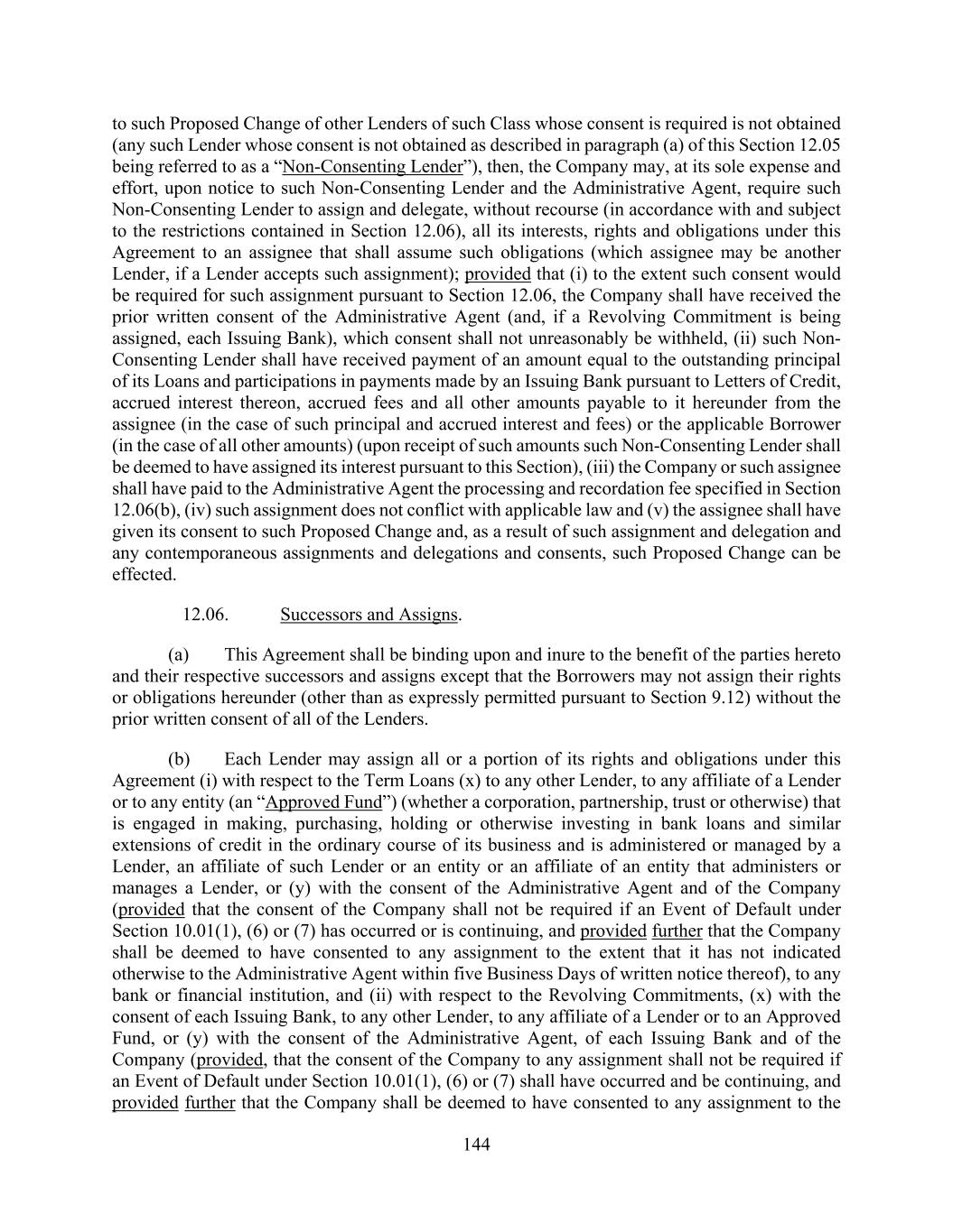 144对未获得所需同意的此类类别的其他贷款人(任何未获得本条第12.05条(a)款所述同意的此类贷款人称为“非同意贷款人”)的此类拟议变更,则,公司可在向该非同意贷款人和行政代理人发出通知后,自行承担费用和努力,要求该非同意贷款人在无追索权的情况下(根据并受制于第12.06条所载的限制)转让和转授其所有利益,本协议项下对应承担此类义务的受让人的权利和义务(如果贷款人接受此类转让,则该受让人可能是另一贷款人);但(i)在根据第12.06条此类转让需要此类同意的范围内,公司应已收到行政代理人的事先书面同意(如果正在转让循环承诺,则为各开证银行),该同意不得无理拒绝,(ii)该非同意贷款人须已从受让人(如属该等本金及应计利息及费用)或适用借款人(如属所有其他款项)(在收到该等款项后,该非同意贷款人须当作已根据本条转让其权益)收到相当于其贷款未偿还本金及参与开证银行依据信用证作出的付款的款项,(iii)公司或该等受让人须已向行政代理人支付第12.06(b)条所指明的处理及记录费,(iv)该等转让与适用法律并无冲突,及(v)该受让人须已就该等建议更改给予同意,而由于该等转让及转授以及任何同期转让及转授及同意,该等建议更改可予实施。12.06.继任者和分配人。(a)本协议对协议各方及其各自的继承人和转让人具有约束力,并对其有利,但未经所有贷款人事先书面同意,借款人不得转让其在本协议下的权利或义务(根据第9.12条明确允许的除外)。(b)各贷款人可将其根据本协议(i)就定期贷款(x)所享有的全部或部分权利和义务转让给任何其他贷款人、贷款人的任何关联公司或在其正常业务过程中从事提供、购买、持有或以其他方式投资于银行贷款和类似信贷展期并由贷款人管理或管理的任何实体(“经批准的基金”)(无论是公司、合伙企业、信托或其他),该贷款人的关联公司或管理或管理贷款人的实体或实体的关联公司,或(y)经行政代理人和公司的同意(但如果根据第10.01(1)、(6)或(7)条发生的违约事件已经发生或正在继续,则不需要公司的同意,并进一步规定,公司应被视为已同意任何转让,只要其未在书面通知后五个营业日内向行政代理人另有说明),向任何银行或金融机构作出,及(ii)就循环承诺而言,(x)经各发行银行、任何其他贷款人、贷款人的任何联属公司或认可基金同意,或(y)经各发行银行及公司的行政代理人同意(但如根据第10.01(1)、(6)或(7)条的违约事件已发生并仍在继续,则无须要求公司同意任何转让,并进一步订定,公司须当作已同意任何转让予