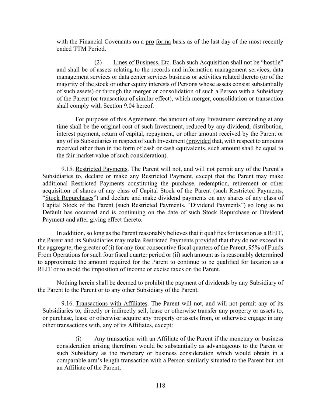 118与财务契诺在备考基础上截至最近结束的TTM期间的最后一天。(2)业务线等。每项该等收购均不得为“敌对”资产,且应为与记录和信息管理服务、数据管理服务或数据中心服务业务或与之相关的活动有关的资产(或其资产实质上由该等资产组成的人的大部分股票或其他股权)或通过该人与母公司的子公司合并或合并(或类似效果的交易),该合并、合并或交易应符合本协议第9.04条。就本协议而言,任何时间未偿还的投资金额应为该投资的原始成本,减去母公司或其任何子公司就该投资收到的任何股息、分配、利息支付、资本返还、还款或其他金额(但就非以现金或现金等价物形式收到的金额而言,该金额应等于该对价的公允市场价值)。9.15.受限制的付款。母公司不会、也不会容许母公司的任何附属公司申报或作出任何受限制的付款,但母公司可作出额外的受限制付款,构成购买、赎回、报废或以其他方式取得母公司任何类别股本的股份(该等受限制付款,“股票回购”),并就母公司任何类别股本的任何股份申报及作出股息支付(该等受限制付款,“股息支付”),只要没有发生违约,并且在此类股票回购或股息支付之日并在其生效后仍在继续。此外,只要母公司合理地认为其有资格作为REIT纳税,母公司及其子公司可以进行限制性付款,但条件是这些款项的总额不超过(i)母公司任何连续四个财政季度、该四个财政季度期间运营资金的95%或(ii)合理确定的金额,以近似于母公司继续有资格作为REIT纳税或避免对母公司征收所得税或消费税所需的金额,两者中的较高者。此处的任何内容均不应被视为禁止母公司的任何子公司向母公司或母公司的任何其他子公司支付股息。9.16.与关联公司的交易。母公司不会、也不会允许其任何附属公司直接或间接向其任何附属公司出售、租赁或以其他方式转让任何财产或资产,或向其任何附属公司购买、租赁或以其他方式取得任何财产或资产,或以其他方式与其进行任何其他交易,但以下情况除外:(i)与母公司的关联公司进行的任何交易,如果由此产生的货币或业务对价对母公司或此类子公司的好处与在与与母公司类似但不是母公司关联公司的人进行的可比公平交易中获得的货币或业务对价大致相同;