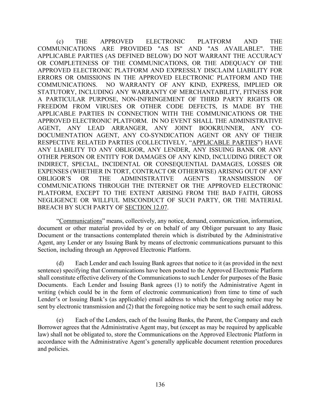 136(c)核准的电子平台和通信按“原样”和“可用”提供。适用方(定义如下)不对来文的准确性或完整性、或核准的电子平台的充分性进行保证,并对核准的电子平台和来文中的错误或遗漏明确免责。任何形式的明示、默示或法定保证,包括任何关于适销性、特定目的适当性、不侵犯第三方权利或免受病毒或其他代码缺陷影响的保证,均不由适用方与通信或经批准的电子平台相关作出。在任何情况下,行政代理人、任何牵头安排人、任何联合账簿管理人、任何联合文件代理人、任何联合文件代理人或其各自的任何关联方(统称“适用方”)均不得对任何义务人、任何出借人、任何发行银行或任何其他人或实体承担任何责任,包括直接或非该当事人的不良信仰、重大过失或者故意不当行为,或者该当事人重大违反第12.07条的情形除外。“通信”统称指由任何义务人或代表任何义务人根据任何基本文件或其中所设想的交易提供的任何通知、要求、通信、信息、文件或其他材料,由行政代理人、任何贷款人或任何开证银行根据本条以电子通信方式分发,包括通过经批准的电子平台分发。(d)各贷款人和各开证银行同意,就基本文件而言,向其发出的通知(如下一句所规定)指明通信已张贴到经批准的电子平台,应构成向该贷款人有效交付通信。各贷款人和开证行同意(1)不时以书面(可采用电子通信形式)通知行政代理人上述贷款人或开证行的(如适用)电子邮件地址,而上述通知可通过电子传输发送至该电子邮件地址,以及(2)上述通知可发送至该电子邮件地址。(e)每一贷款人、每一开证银行、母公司、公司和每一借款人同意,行政代理人可以但(除适用法律可能要求的情况外)没有义务按照行政代理人普遍适用的文件保留程序和政策将通信存储在经批准的电子平台上。