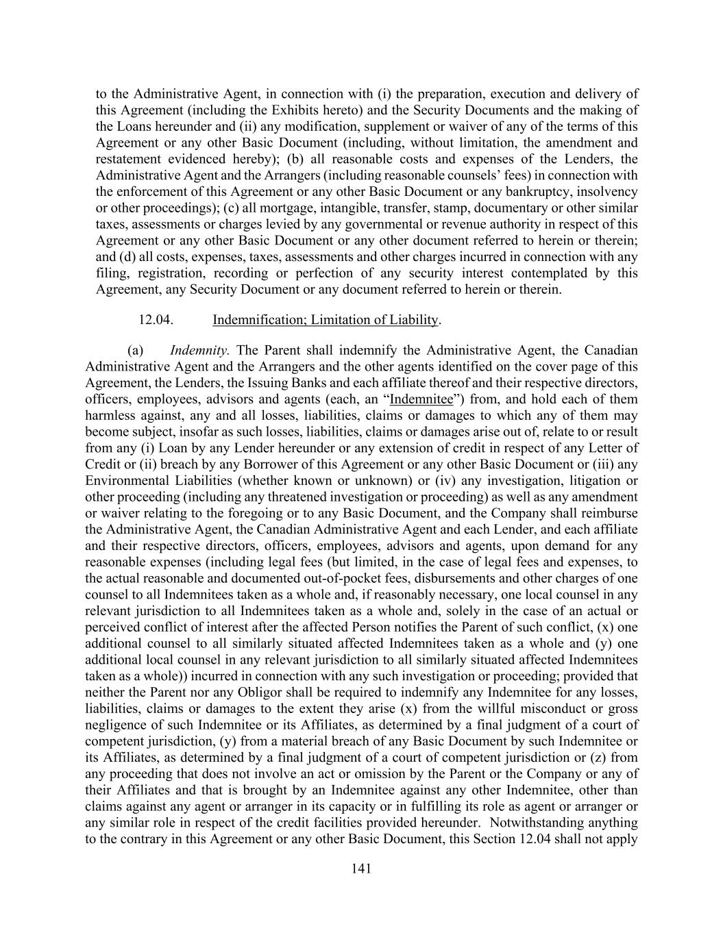 141致行政代理人,就(i)本协议(包括本协议的证物)和担保文件的编制、执行和交付以及根据本协议提供的贷款以及(ii)对本协议或任何其他基本文件的任何条款的任何修改、补充或放弃(包括但不限于在此证明的修改和重述);(b)贷款人、行政代理人和安排人与本协议或任何其他基本文件的执行或任何破产有关的所有合理费用和开支(包括合理的律师费用),破产或其他程序);(c)任何政府或税收当局就本协议或任何其他基本文件或本文或其中提及的任何其他文件征收的所有抵押、无形资产、转让、印花、跟单或其他类似税款、评估或费用;(d)与本协议、任何担保文件或本文或其中提及的任何文件所设想的任何担保权益的任何备案、登记、记录或完善有关的所有成本、费用、税款、评估和其他费用。12.04.赔偿;责任限制。(a)赔偿。母公司应赔偿行政代理人、加拿大行政代理人和安排人以及本协议封面所列的其他代理人、贷款人、发行银行及其每一关联公司及其各自的董事、高级职员、雇员、顾问和代理人(各自为“受偿人”),并使他们各自免受他们中的任何人可能遭受的任何和所有损失、责任、索赔或损害,只要这些损失、责任、索赔或损害是由,与任何(i)任何贷款人根据本协议提供的贷款或与任何信用证有关的任何信贷展期或(ii)任何借款人违反本协议或任何其他基本文件或(iii)任何环境责任(不论已知或未知)或(iv)任何调查、诉讼或其他程序(包括任何威胁调查或程序)以及与上述或任何基本文件有关的任何修订或放弃有关或导致,而公司须向行政代理人、加拿大行政代理人及每名贷款人及每名联属公司及其各自的董事作出补偿,高级职员、雇员、顾问和代理人,应要求支付任何合理费用(包括律师费(但在律师费和开支的情况下,仅限于一名大律师向整体所有受偿人支付的实际合理和有文件证明的自付费用、付款和其他费用,如有合理必要,在任何相关司法管辖区向整体所有受偿人支付的一名当地大律师,以及仅在受影响的人将此类冲突通知家长后发生实际或感知的利益冲突的情况下,(x)就任何该等调查或法律程序而招致的所有情况类似的受影响受保人的整体额外一名大律师及(y)在任何有关司法管辖区就所有情况类似的受影响受保人的整体额外一名本地大律师);但不得要求父母或任何义务人就任何受保人的任何损失、法律责任、申索或损害作出赔偿,只要这些损失、法律责任、申索或损害是(x)由具有主管司法管辖权的法院的最终判决所裁定,(y)该等受偿人或其联属公司严重违反任何基本文件,而该等重大违反是由具有主管司法管辖权的法院的最终判决所裁定,或(z)来自任何不涉及母公司或公司或其任何联属公司的作为或不作为且由受偿人向任何其他受偿人提起的法律程序,但以其身份或在履行其作为代理人或安排人的角色时向任何代理人或安排人提出的索偿或就本协议项下所提供的信贷融资的任何类似角色提出的索偿除外。即使本协议或任何其他基本文件有任何相反规定,本条第12.04条并不适用