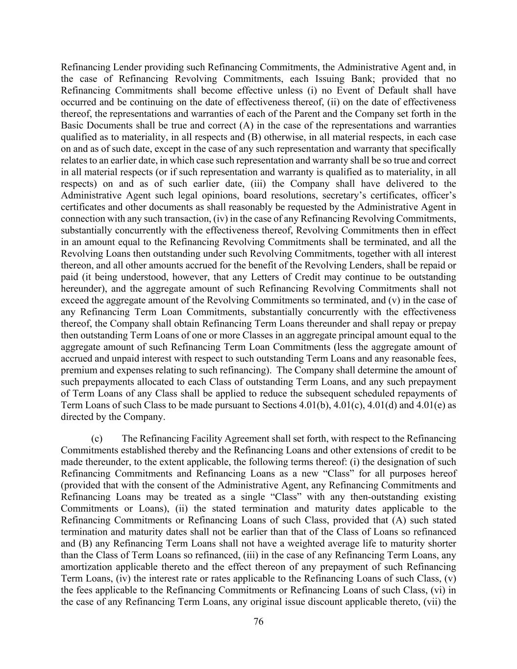 76提供该等再融资承诺的再融资贷款人、行政代理人,如为再融资循环承诺,则为各发行银行;但任何再融资承诺均不得生效,除非(i)在其生效之日没有发生违约事件并仍在继续,(ii)在其生效之日,母公司和公司各自在基本文件中所载的陈述和保证在所有方面均应是真实和正确的(a)在对重要性有限定的陈述和保证的情况下,以及(b)否则,就所有重大方面而言,就每宗个案而言,在该日期当日及截至当日,除特别关乎较早日期的任何该等陈述及保证外,在该情况下,该等陈述及保证于该较早日期当日及截至当日,在所有重大方面(或如该等陈述及保证在所有方面均符合重要性)均须如此真实及正确,(iii)公司须已向行政代理人交付该等法律意见、董事会决议、秘书证明书,行政代理人就任何该等交易合理要求的高级人员证明书及其他文件,(iv)就任何再融资循环承诺而言,在实质上与其有效性同时发生的情况下,须终止当时有效的、金额相当于再融资循环承诺的循环承诺,并须偿还或支付当时根据该等循环承诺未偿还的所有循环贷款,连同其所有利息,以及为循环贷款人的利益而累积的所有其他金额(但据了解,本协议项下的任何信用证可能继续未结清),且该等再融资循环承诺的总额不得超过如此终止的循环承诺的总额,及(v)就任何再融资定期贷款承诺而言,与其有效性基本同步,公司应根据该协议获得再融资定期贷款,并应偿还或提前偿还当时未偿还的一个或多个类别的定期贷款,本金总额等于该等再融资定期贷款承诺的总额(减去与该等未偿还定期贷款有关的应计和未付利息总额以及与该等再融资有关的任何合理费用、溢价和开支)。公司须厘定分配予每类未偿还定期贷款的该等提前还款的金额,而任何类别的定期贷款的任何该等提前还款须适用于减少根据公司指示根据第4.01(b)、4.01(c)、4.01(d)及4.01(e)条作出的该等类别定期贷款的后续预定还款。(c)再融资便利协议应在适用范围内就由此确立的再融资承诺以及根据该协议将作出的再融资贷款和其他信贷延期规定以下条款:(i)为本协议的所有目的将此类再融资承诺和再融资贷款指定为新的“类别”(但经行政代理人同意,任何再融资承诺和再融资贷款可与任何当时未偿还的现有承诺或贷款视为单一的“类别”),(ii)适用于该类别的再融资承诺或再融资贷款的指明终止及到期日期,但(a)该等指明终止及到期日期不得早于如此再融资的贷款类别,及(b)任何再融资定期贷款的加权平均到期期限不得短于如此再融资的定期贷款类别,(iii)就任何再融资定期贷款而言,适用于该等再融资定期贷款的任何摊销及该等再融资定期贷款的任何提前还款对其的影响,(iv)适用于该类别再融资贷款的利率,(v)适用于该类别再融资承诺或再融资贷款的费用,(vi)就任何再融资定期贷款而言,适用于该类别的任何原始发行折扣,(vii)