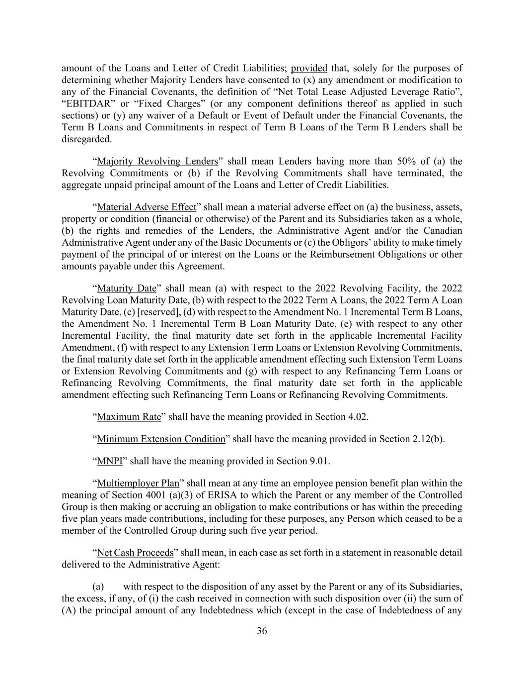 贷款和信用证负债的36个金额;但仅为确定多数贷款人是否同意(x)对任何财务契约的任何修订或修改、“净总租赁调整杠杆率”、“EBITDAR”或“固定费用”(或此类章节中适用的任何组成部分定义)的定义或(y)对财务契约项下的违约或违约事件的任何放弃,B期贷款人的B期贷款和有关B期贷款的承诺应不予考虑。“多数循环贷款人”是指(a)循环承诺或(b)如果循环承诺已终止,则贷款和信用证负债的未付本金总额超过50%的贷款人。“重大不利影响”是指对(a)母公司及其子公司作为一个整体的业务、资产、财产或状况(财务或其他方面),(b)贷款人、行政代理人和/或加拿大行政代理人在任何基本文件下的权利和补救措施,或(c)债务人及时支付贷款本金或利息或偿还义务或根据本协议应付的其他金额的能力产生重大不利影响。“到期日”是指(a)就2022年循环贷款而言,2022年循环贷款到期日,(b)就2022年A期贷款而言,2022年A期贷款到期日,(c)[保留],(d)就第1号修正案B期增量贷款而言,第1号修正案B期增量贷款到期日,(e)就任何其他增量融资而言,适用的增量融资修正案中规定的最后到期日,(f)就任何延期定期贷款或延期循环承诺而言,影响该等延长定期贷款或延长循环承诺的适用修订所载的最后到期日及(g)就任何再融资定期贷款或再融资循环承诺而言,影响该等再融资定期贷款或再融资循环承诺的适用修订所载的最后到期日。“最高额”应具有第4.02节规定的含义。“最低延期条件”应具有第2.12(b)节规定的含义。“MNPI”应具有第9.01条规定的含义。“多雇主计划”是指在ERISA第4001(a)(3)节含义内的雇员养老金福利计划,其母公司或受控集团的任何成员当时正在向其作出或累积作出供款的义务,或已在前五个计划年度内作出供款,包括为此目的,在该五年期间不再是受控集团成员的任何人。“现金收益净额”是指,在交付给行政代理人的合理详细的报表中所述的每一种情况下:(a)就母公司或其任何子公司处置任何资产而言,(i)就此类处置而收到的现金超过(ii)(a)任何债务的本金额之和的部分(如果有的话)超出(a)任何债务的本金额之和(但任何债务的情况除外)
