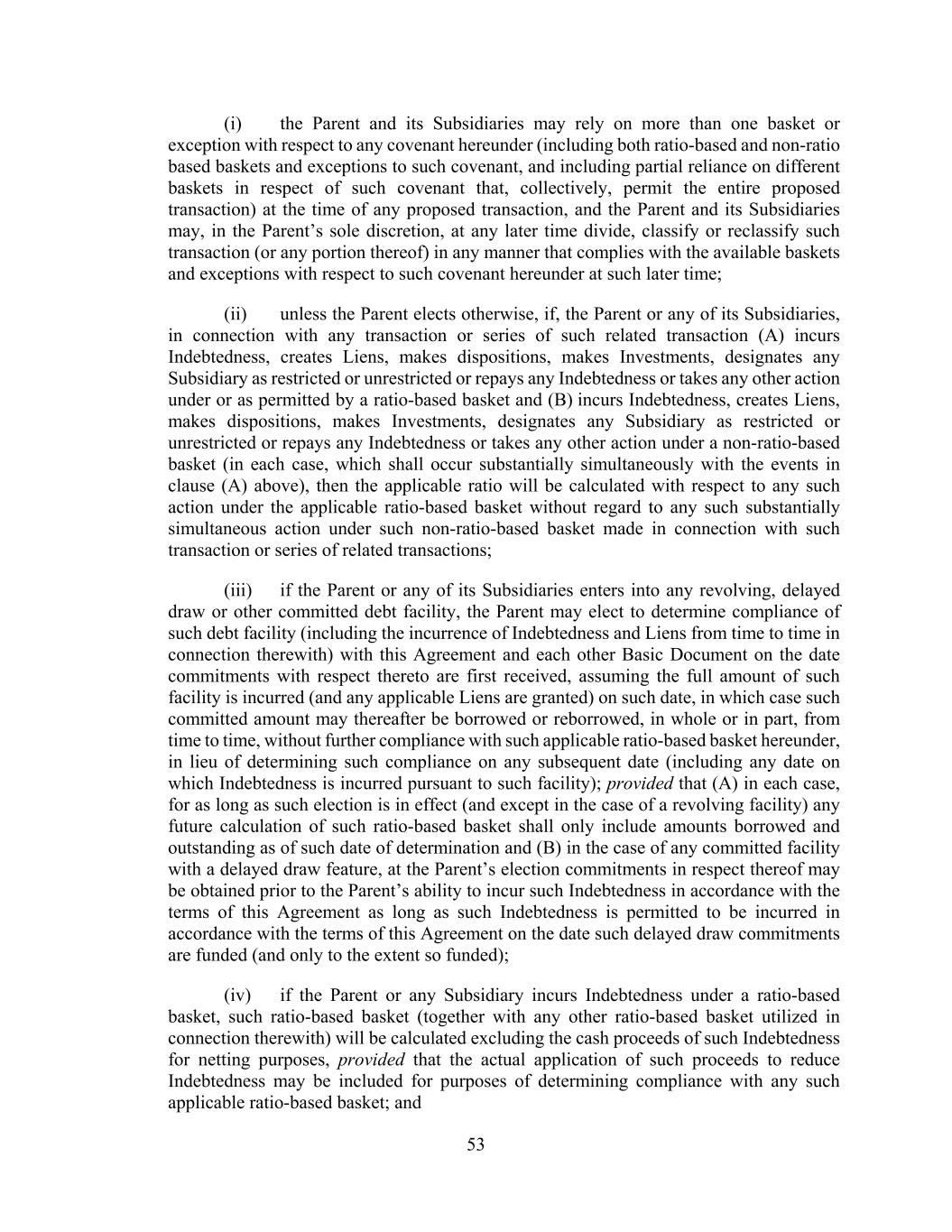 53(i)母公司及其子公司可在任何拟议交易发生时就本协议项下的任何契诺依赖一个以上的篮子或例外(包括基于比率和非基于比率的篮子以及该契诺的例外情况,包括就该契诺部分依赖不同的篮子,这些篮子共同允许整个拟议交易),而母公司及其子公司可在任何以后的时间全权酌情划分,(ii)除非母公司或其任何附属公司另有选择,如与该等相关交易的任何交易或系列有关(a)产生债务、设定留置权、进行处置、进行投资、指定任何附属公司为受限制或不受限制的或偿还任何债务或根据基于比率的篮子或在基于比率的篮子允许的情况下采取任何其他行动,以及(b)产生债务、设定留置权、进行处置、进行投资,指定任何附属公司为受限制或不受限制或偿还任何债务或在非以比率为基础的一篮子下采取任何其他行动(在每种情况下,应与上述(A)条中的事件基本同时发生),则将就适用的以比率为基础的一篮子下的任何此类行动计算适用的比率,而不考虑与该交易或一系列相关交易有关的此类非以比率为基础的一篮子下的任何此类基本同时行动;(iii)如果母公司或其任何附属公司订立任何循环、延迟提款或其他承诺债务融资,母公司可选择在首次收到与此相关的承诺之日确定此类债务融资(包括不时产生与此相关的债务和留置权)是否符合本协议和彼此的《基本文件》,前提是此类融资的全部金额在该日期发生(以及任何适用的留置权被授予),在这种情况下,此类承诺金额此后可不时全部或部分借入或再借出,而无需进一步遵守本协议项下的此类适用的基于比率的篮子,代替在随后的任何日期(包括根据该融资产生债务的任何日期)确定此类遵守情况;但(a)在每种情况下,只要该选择有效(且循环融资的情况除外),该基于比率的篮子的任何未来计算应仅包括截至该确定日期已借入和未偿还的金额,以及(b)在具有延迟提款特征的任何已承诺融资的情况下,经母公司选择,可在母公司根据本协议条款承担此类债务的能力之前获得与此相关的承诺,只要在此类延迟提款承诺获得资金之日(且仅限于获得资金的范围内)根据本协议条款允许承担此类债务;(iv)如果母公司或任何子公司根据基于比率的篮子承担债务,此类基于比率的篮子(连同与之相关使用的任何其他基于比率的篮子)的计算将不包括用于净额结算目的的此类债务的现金收益,但为确定遵守任何此类适用的基于比率的篮子的目的,可将此类收益用于减少债务的实际应用包括在内;和