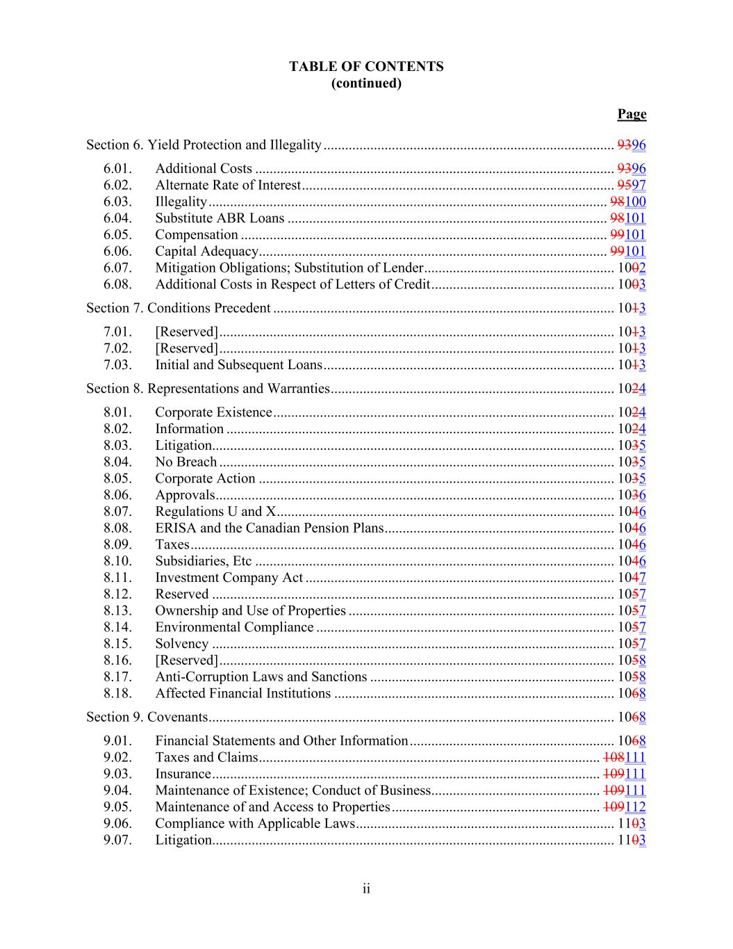 目录(续)第二页第6节。产量保护与违法...................................................................................9 3966.01。额外费用...................................................................................................9 3966.02。备用利率.....................................................................................95 976.03。违法行为...................................................................................................................98 1006.04。替代ABR贷款...................................................................................................98 1016.05。赔偿......................................................................................................99 1016.06。资本充足...................................................................................................................99 1016.07。缓解义务;替代贷款人.................................................................... 10026.08。信用证方面的附加费用...................................................................1003第七节。先决条件....................................................................................………………………………………………………………………………………………………………………………………………………………………………………………………………………………………………………………………………………………………………………………【保留】......................................................................................................... 10 137.02。【保留】......................................................................................................... 10 137.03。首期及后续贷款.................................................................................... 1013第8节。陈述和保证.................................................................................... 10248.01。企业存续情况.................................................................................... 10248.02。信息.................................................................................................... 10 248.03。诉讼.................................................................................................... 10 358.04。不违约.................................................................................................... 10 358.05。企业行动.................................................................................... 10 358.06。批准.................................................................................................... 10 368.07。条例U和X........................................................................................ 10468.08。ERISA和加拿大养老金计划.................................................................... 10468.09。税收......................................................................................................................10 468.10。子公司, 等.................................................................................... 10468.11。投资公司法......................................................................................10 478.12。保留.................................................................................................... 10578.13。财产的所有权和使用.................................................................................... 10578.14。环境合规.................................................................................... 10578.15。偿债能力.................................................................................................... 10578.16。【保留】........................................................................................................ 10588.17。反腐败法律与制裁.................................................................... 10588.18。受影响的金融机构.................................................................................... 1068第9节。盟约.................................................................................................... 10689.01。财务报表及其他信息.................................................... 10689.02。税收和债权.................................................................................................... 1081119.03。保险.................................................................................................... 1091119.04。维持存在;开展业务.................................................... 1091119.05。物业的维护和使用.................................................................... 1091129.06。遵守适用法律.................................................................... 11039.07。诉讼.................................................................................................... 1103