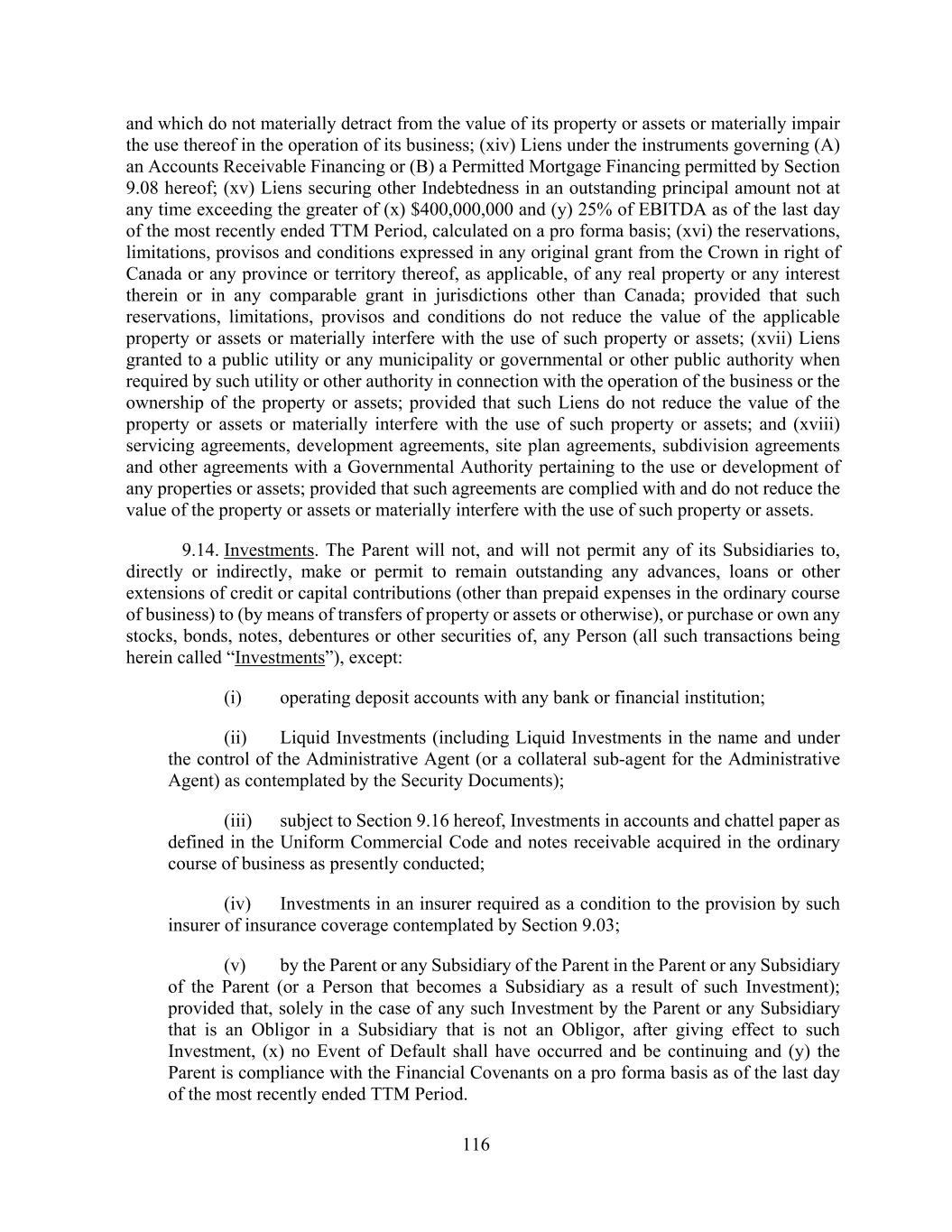 116且不会对其财产或资产的价值造成重大减损或对其在业务运营中的使用造成重大损害;(xiv)管辖(a)应收账款融资或(b)本协议第9.08条允许的许可抵押融资的文书项下的留置权;(xv)为未偿本金金额在任何时候均不超过(x)400,000,000美元和(y)截至最近结束的TTM期间最后一天EBITDA的25%(以备考方式计算)的较高者提供担保的留置权;(xvi)保留、限制、加拿大官方或其任何省或地区(如适用)对任何不动产或其中的任何权益或在加拿大以外的法域的任何类似赠款的任何原始赠款中表达的但书和条件;但前提是此类保留、限制,但书和条件不会降低适用财产或资产的价值或实质上干扰此类财产或资产的使用;(xvii)当公用事业或其他当局就业务运营或财产或资产的所有权提出要求时,授予该公用事业或任何市政当局或政府或其他公共当局的留置权;但前提是此类留置权不会降低该财产或资产的价值或实质上干扰该财产或资产的使用;以及(xviii)服务协议、开发协议、场地规划协议,与政府当局就任何财产或资产的使用或开发达成的细分协议和其他协议;前提是此类协议得到遵守,且不会降低财产或资产的价值,或对此类财产或资产的使用产生实质性干扰。9.14.投资。母公司不会、也不会允许其任何子公司直接或间接向(通过转让财产或资产或其他方式)提供或允许未偿还的任何垫款、贷款或其他信贷或出资延期(正常经营过程中的预付费用除外),或购买或拥有任何人的任何股票、债券、票据、债权证或其他证券(所有这些交易在此称为“投资”),(i)在任何银行或金融机构的经营存款账户;(ii)流动投资(包括以担保文件所设想的行政代理人(或行政代理人的担保子代理人)名义并在其控制下的流动投资);(iii)在符合本条例第9.16条的规定下,对《统一商法典》中定义的账户和动产票据以及在目前进行的正常业务过程中获得的应收票据的投资;(iv)作为该保险人提供第9.03条所设想的保险范围的条件所要求的对该保险人的投资;(v)由母公司或母公司在母公司的任何子公司或母公司的任何子公司(或因该投资而成为子公司的人)进行的投资;但,仅就母公司或在非债务人的附属公司中作为债务人的任何附属公司进行的任何该等投资而言,在该等投资生效后,(x)不得发生任何违约事件且该事件仍在继续,及(y)截至最近结束的TTM期间的最后一天,母公司在备考基础上遵守财务契诺。
