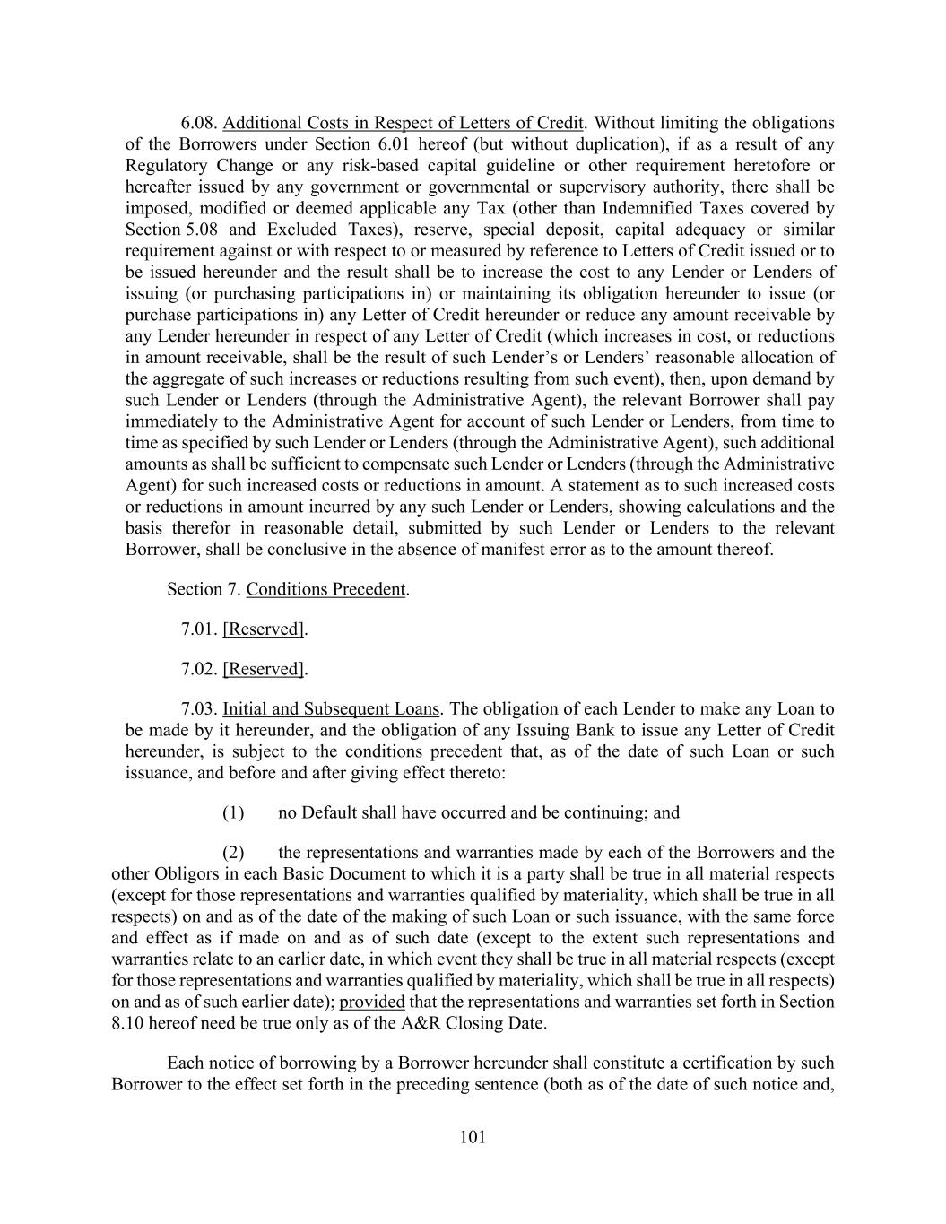 101 6.08.信用证方面的额外费用。在不限制借款人根据本协议第6.01条承担的义务(但不重复)的情况下,如果由于任何监管变更或任何政府或政府或监管机构在此之前或之后发布的任何基于风险的资本准则或其他要求,应征收、修改或视为适用任何税款(第5.08条涵盖的补偿税款和不包括的税款除外)、准备金、特别存款,资本充足性或类似要求,针对或针对或参照根据本协议签发或将签发的信用证进行计量,其结果应是增加任何贷款人或贷款人签发(或购买参与)或维持其根据本协议签发(或购买参与)任何信用证的义务的成本,或减少任何贷款人根据本协议就任何信用证应收的任何金额(这会增加成本,或减少应收金额,应为该等出借人或出借人因该等事件而合理分配该等增加或减少总额的结果),然后,应该等出借人或出借人(通过行政代理人)的要求,相关借款人应立即向该等出借人或出借人的账户的行政代理人支付该等出借人或出借人(通过行政代理人)不时指明的、足以补偿该等出借人或出借人(通过行政代理人)该等增加的成本或减少金额的额外金额。任何该等贷款人或贷款人向有关借款人提交的关于任何该等贷款人或贷款人所招致的此种增加的成本或减少的金额的报表,在其金额没有明显错误的情况下,应具有结论性,并以合理的细节显示计算及其依据。第7节。先决条件。7.01.[保留]。7.02.[保留]。7.03.初始和后续贷款。各贷款人作出其根据本协议拟作出的任何贷款的义务,以及任何开证银行根据本协议签发任何信用证的义务,均受先决条件所规限,即自该等贷款或该等签发之日起,及在其生效之前及之后:(1)不得发生任何违约,且该违约仍在继续;及(2)每名借款人及每名其他义务人在其为一方的每份基本文件中作出的陈述及保证,在作出该等贷款或该等发行之日及截至该日期,在所有重大方面均属真实(但在重要性方面有限定的陈述及保证除外,该等陈述及保证在所有方面均属真实),具有与在该日期和截至该日期作出的相同的效力和效力(除非该等陈述和保证与较早的日期有关,在这种情况下,它们在所有重大方面均为真实(但因重要性而限定的陈述和保证除外,该等陈述和保证在所有方面均为真实)在该较早的日期和截至该日期);但本条例第8.10条所载的陈述和保证只需在A & R截止日期为真实。借款人根据本协议发出的每一份借款通知,均应构成该借款人作出的大意为前一句所述的证明(自该通知发出之日起,以及,